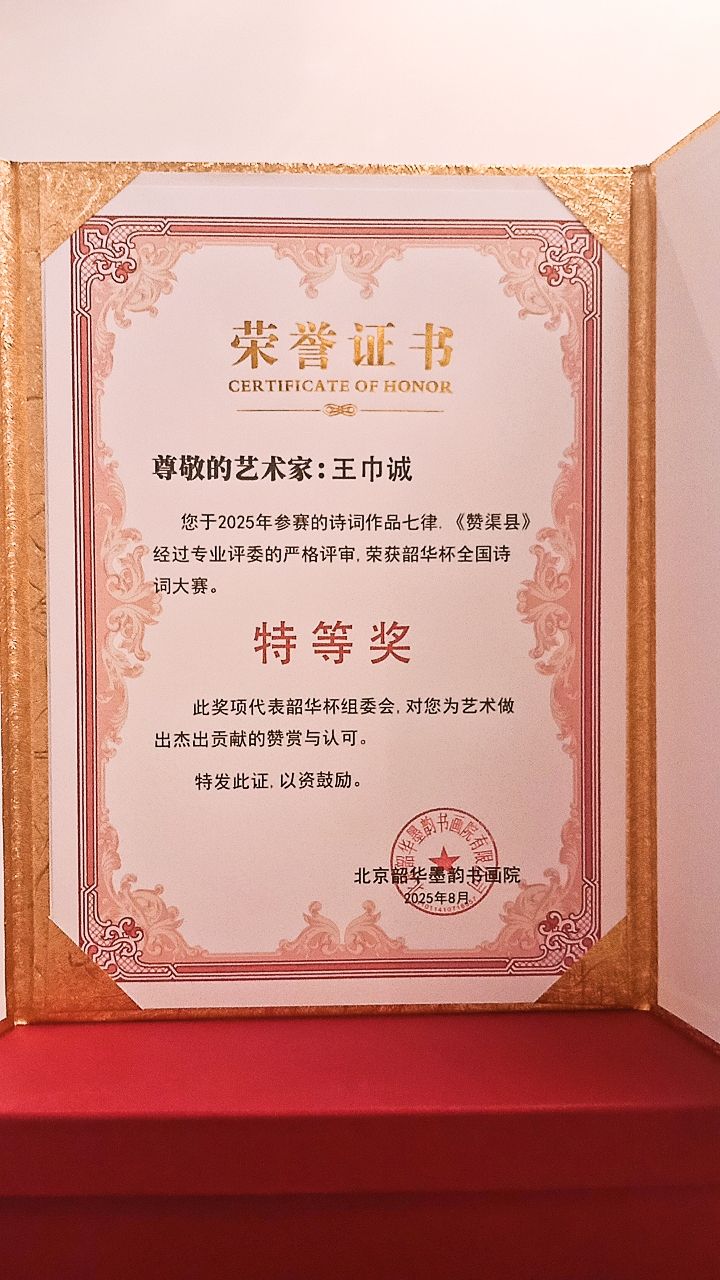 专业评审评语:王巾诚的七律《赞渠县》宛如一幅徐徐展开的绚丽画卷,以灵动的笔触、丰富的意象,全方位、多层次地展现了渠县的自然风光、历史文化和现代发展,让读者在字里行间领略到渠县的独特魅力。