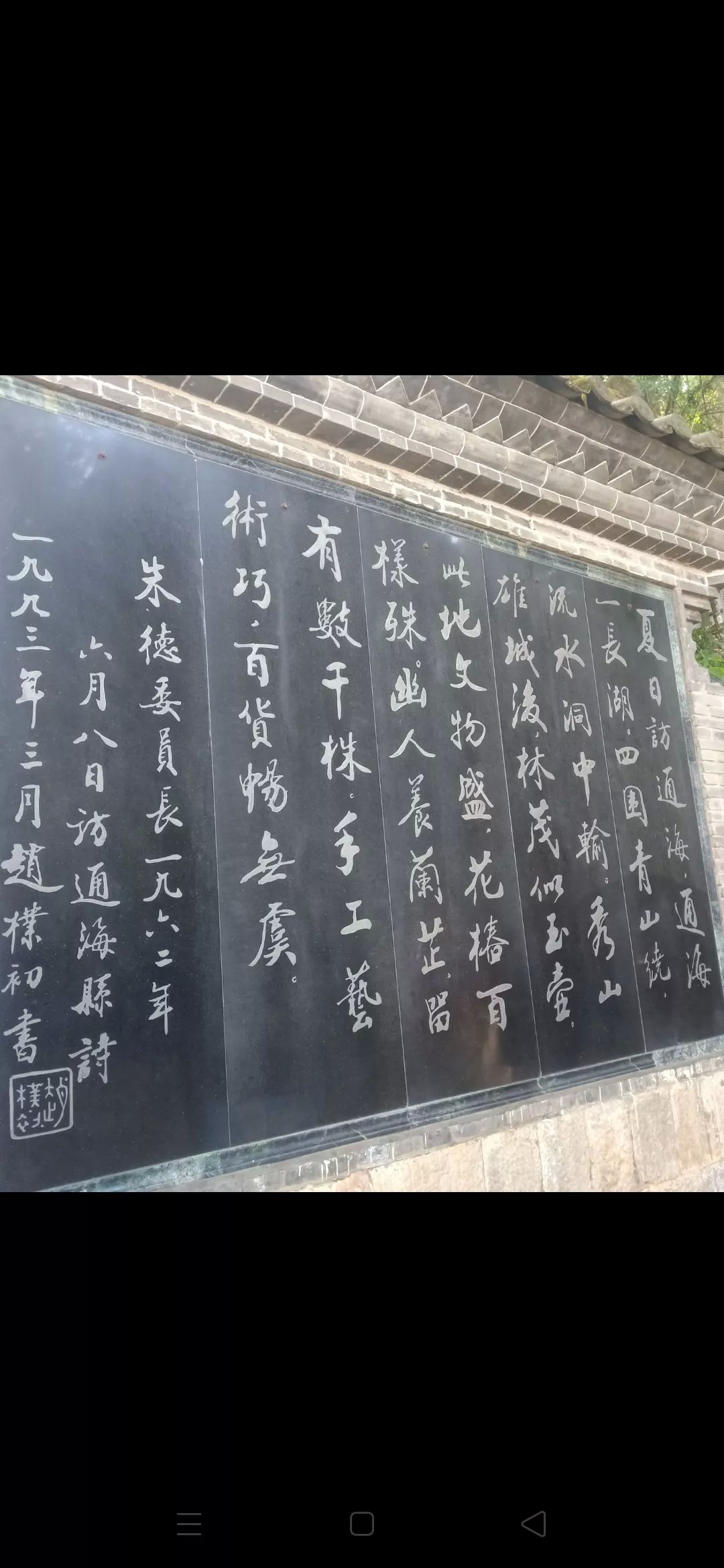时逢节假,人气正旺,门口人头攒动,沸沸扬扬,大有闹市繁华的气势,抬头望门头造型独具风格,古朴典雅,秀山二字苍劲有力,还不乏灵动飞舞之韵,踏入大门的石阶,往上一直是蜿蜒攀岩向上的石梯小路,小路幽幽,尽由松柏和百年枝曼遮遮掩掩,难得觅见太阳的光茫,阴凉之气甚为敏感,山腰间不断有庙堂楼阁座落,使得秀山好似佛堂之地。山道其间也有石牌刻有对联或是文学诗词之类,又使得秀山又是一个适合文人墨客游览的好景地,秀山的另一个 重要特征革命教育基地,秀山山腰间有为通海的解放,建设发展和繁荣而献出生命的革命烈土,救火英雄长眠于此,警示后人今天的平安幸福来之不易。秀山负载着的革命教育意义不仅于此,山中还有一处热点去处是朱德委员的旧居,在苍天古柏的华盖之下有一间简易狭小的居所,难以想像,我们的朱总司令,在其漫长的革命生涯中曾到过通海秀山,在此逗留浅居,给秀山乃至通海付予了红色的印迹。
