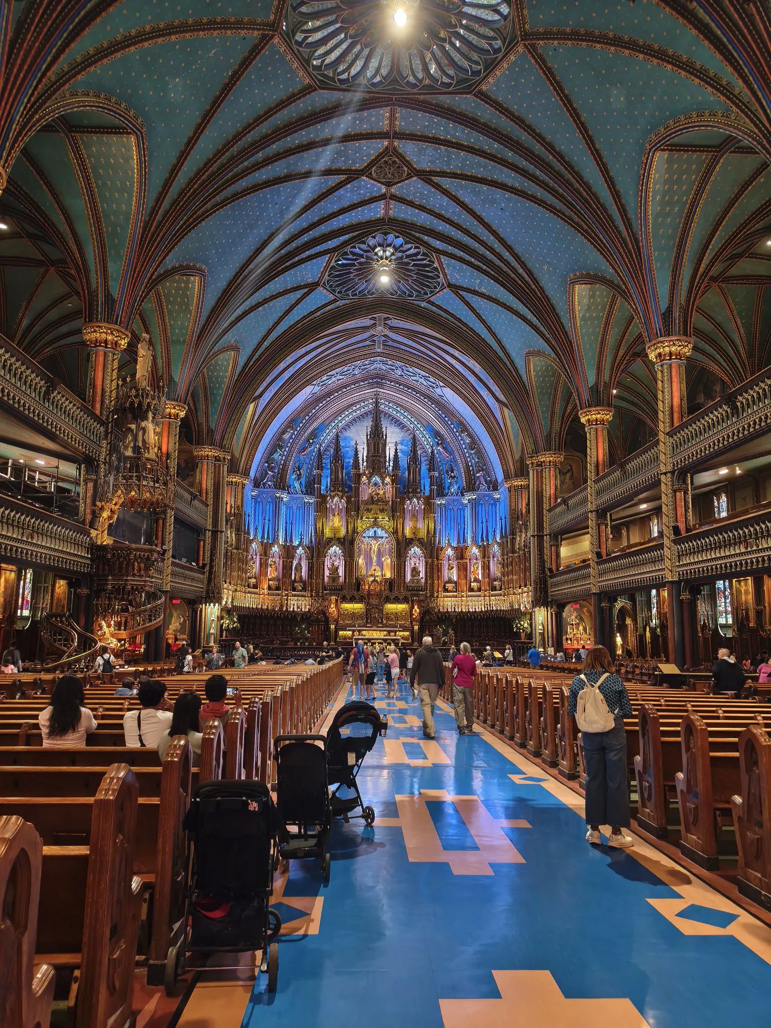 我们给自己安排的时间有点短了,所以只能挑最有名的景点去看看,那首选的就是圣母大教堂了,那教堂确实非常恢宏大气,据说还有小巴黎圣母院的称号呢。也是,魁北克是法国人占领的区域,一切都遵循法国的文化传统嘛。一进去就被那高高的、色彩绚烂的穹顶吸引住了,除了看不懂,就只剩下一个“好”字了。不过,我们懂规矩,进去之后没有大声喧哗,都是轻声讲话。