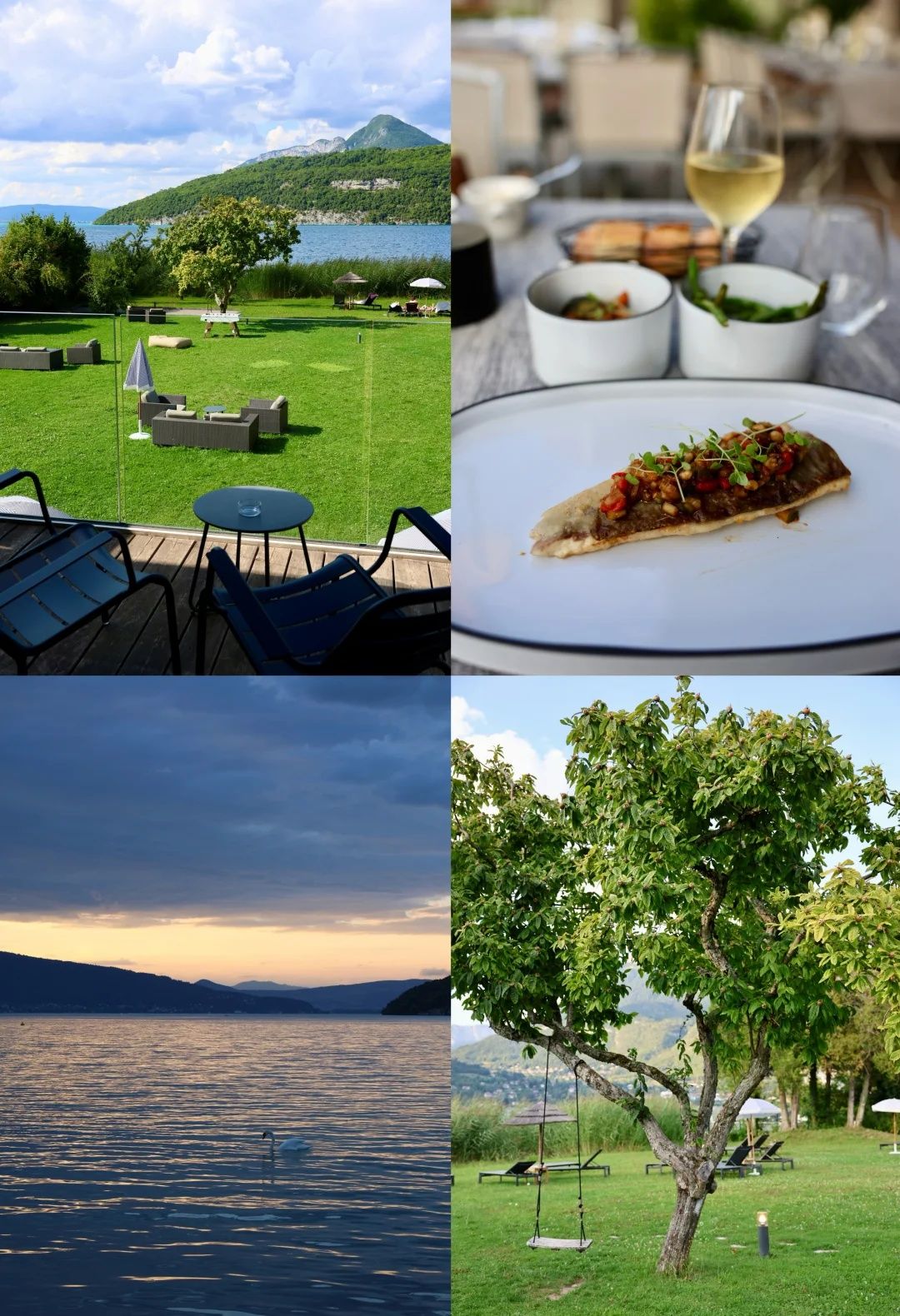 直到,开进酒店的封闭停车场,进了门,一瞬间感觉跟人潮隔开了。办理入住时前台说看我从瑞士来直接把园景小房升级成湖景大房!停车免费还有充电桩。酒店独享了大片漂亮草地,小门出去有私密的小沙滩,有Spa,自己的餐厅和隔壁的餐厅都很棒!价格也没有溢价很多。晚上吃完饭就湖边浅滩走走看夕阳,这一片非常安静。门口也有公交直达安纳西中心。