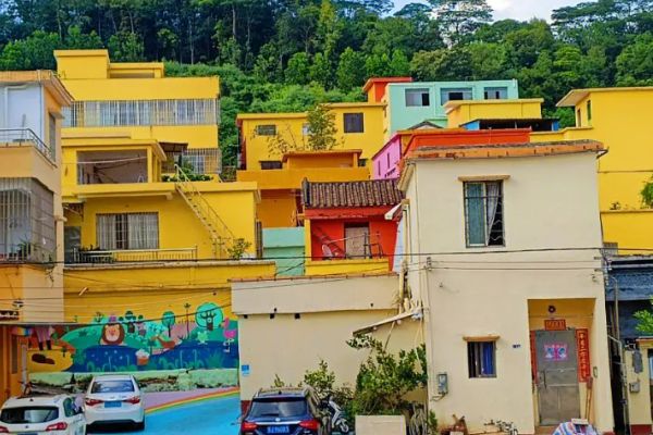 彩虹村就在白水带附近,可以从白水带的牌坊进入。彩虹村原名横坑里,新农村建设改造,把村子里的房屋墙面被粉刷成彩色,还有很多卡通图案,五彩六色的混搭,像一个童话小王国,吸引不少游客打卡拍照。爬上高空绿道可以从半空中俯瞰彩虹村美景,宛若童话仙境。