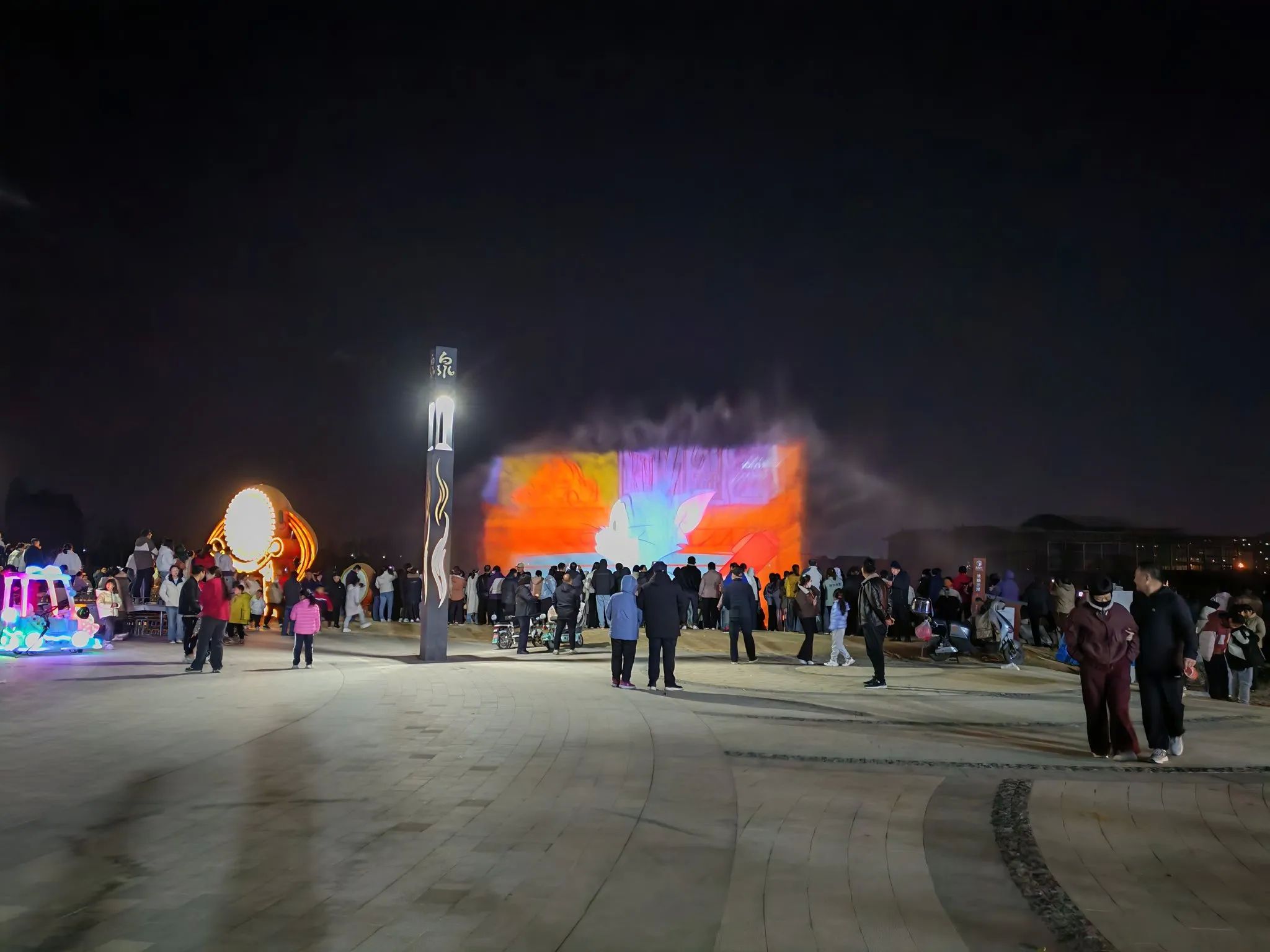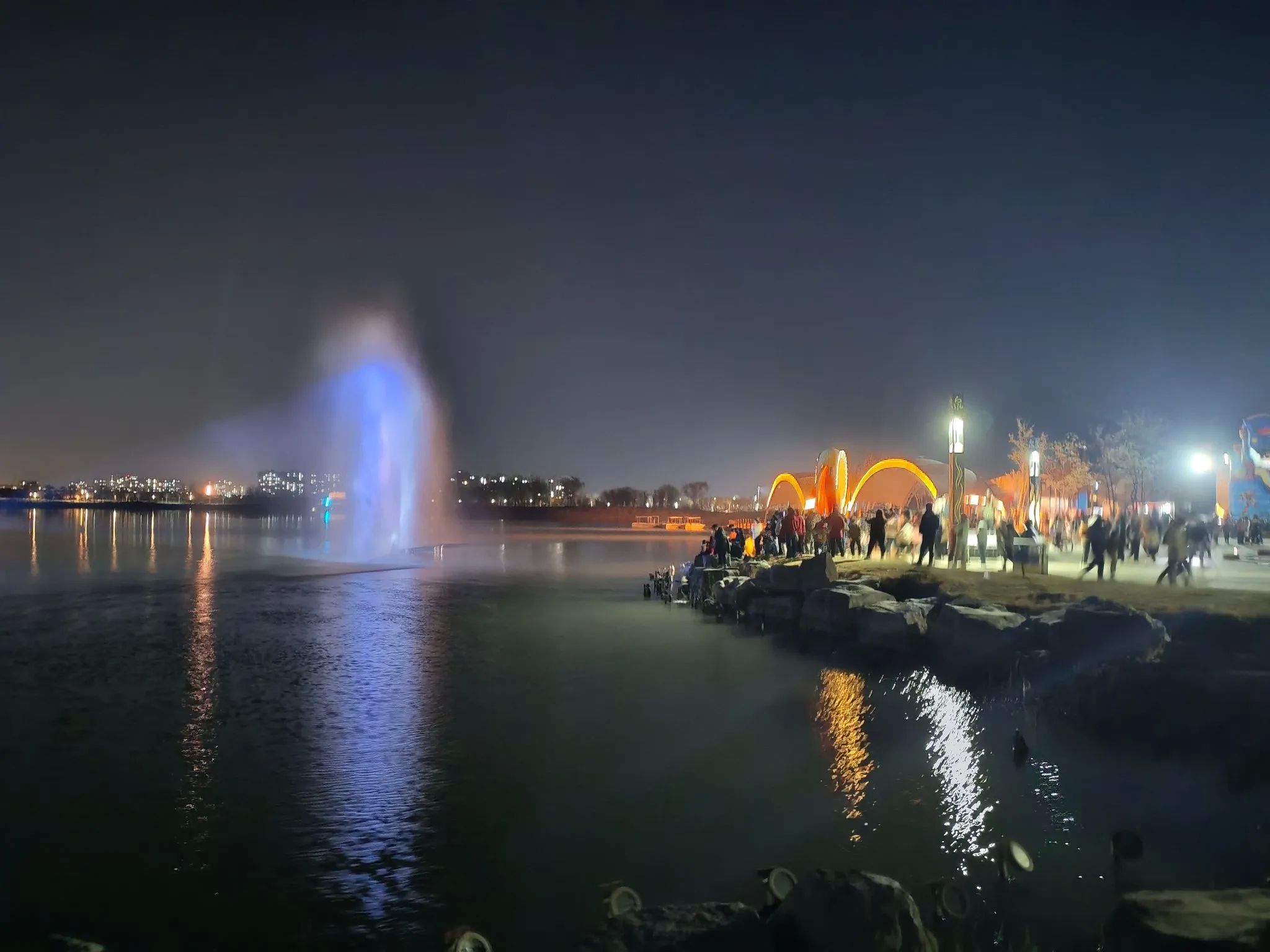散步聊天的时候才知晓,晚上7点半湖中会放映水幕电影,这是公园专门为拉动人气推出的项目。
