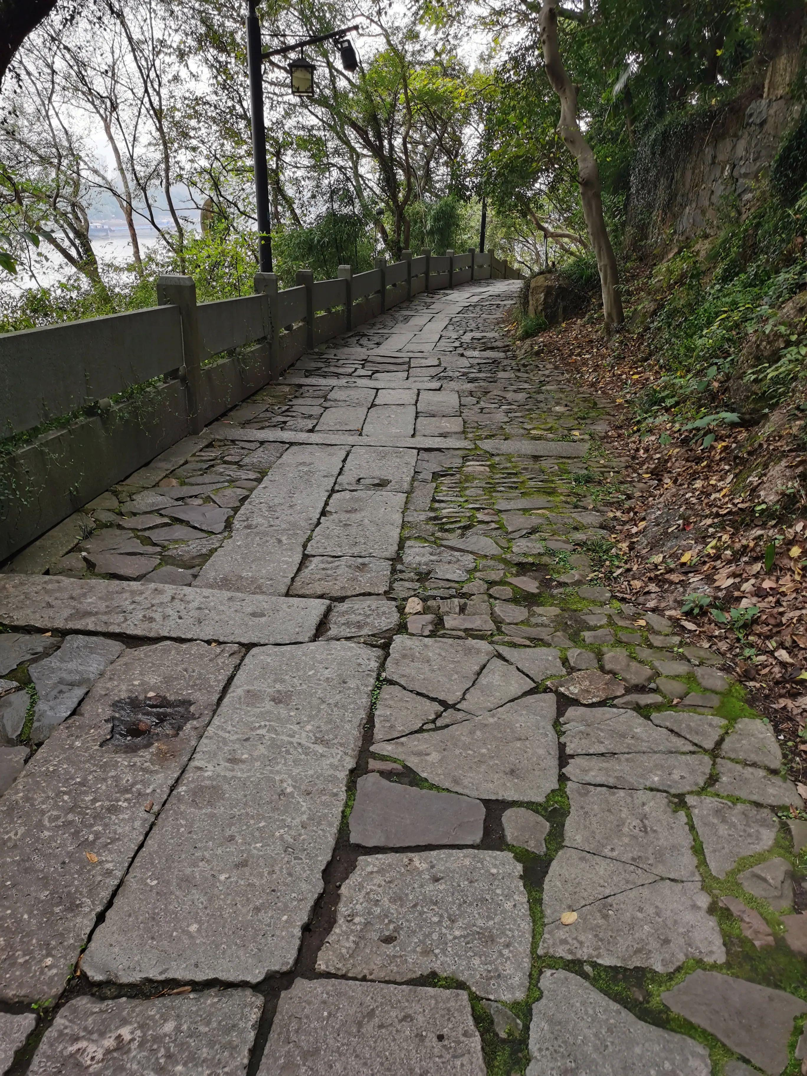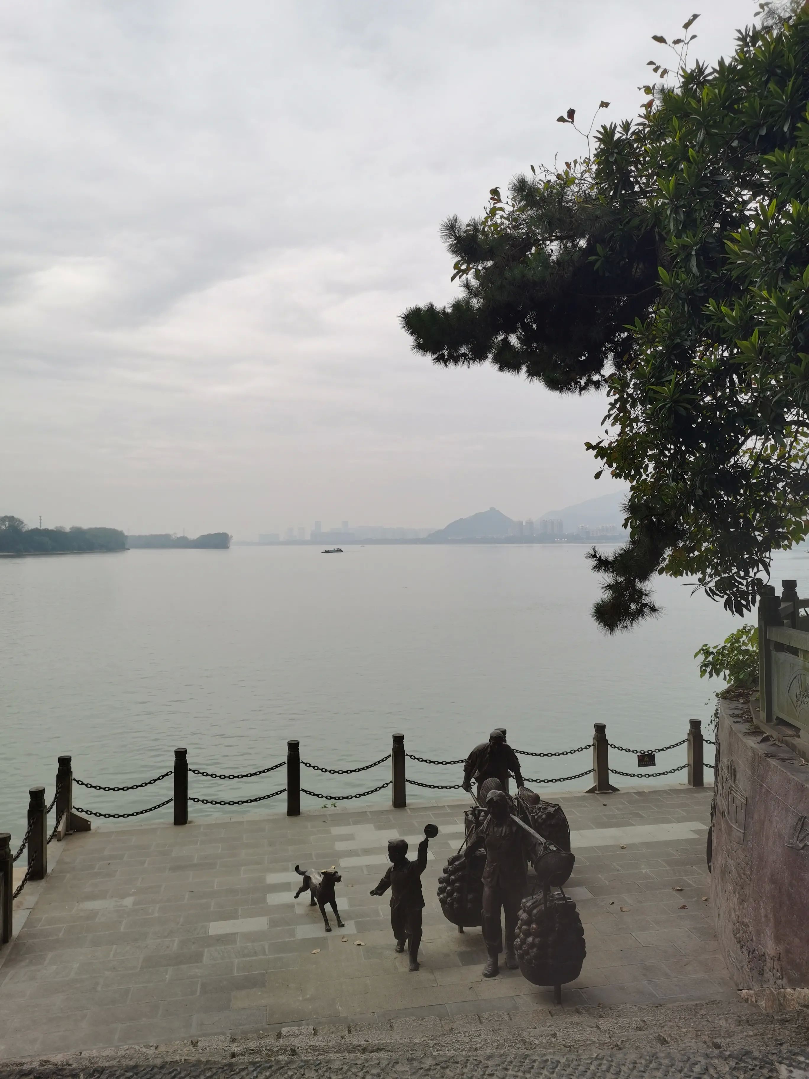 步入公园,古朴的气息扑面而来。一座巍峨的牌坊矗立门前,“鹳山”二字庄重大气,两侧石狮栩栩如生,威武如守护神,高悬的红灯笼则增添了几分亲切详和。沿着蜿蜒的鹅卵石小径或质朴的江滨长廊前行,富春江的浩渺风光便徐徐展开。波光粼粼的江面如同铺开的绸缎,偶有船只犁开清波,搅动一池碎金,对岸景致与横跨江面的大桥尽收眼底,宁静中透着生机。