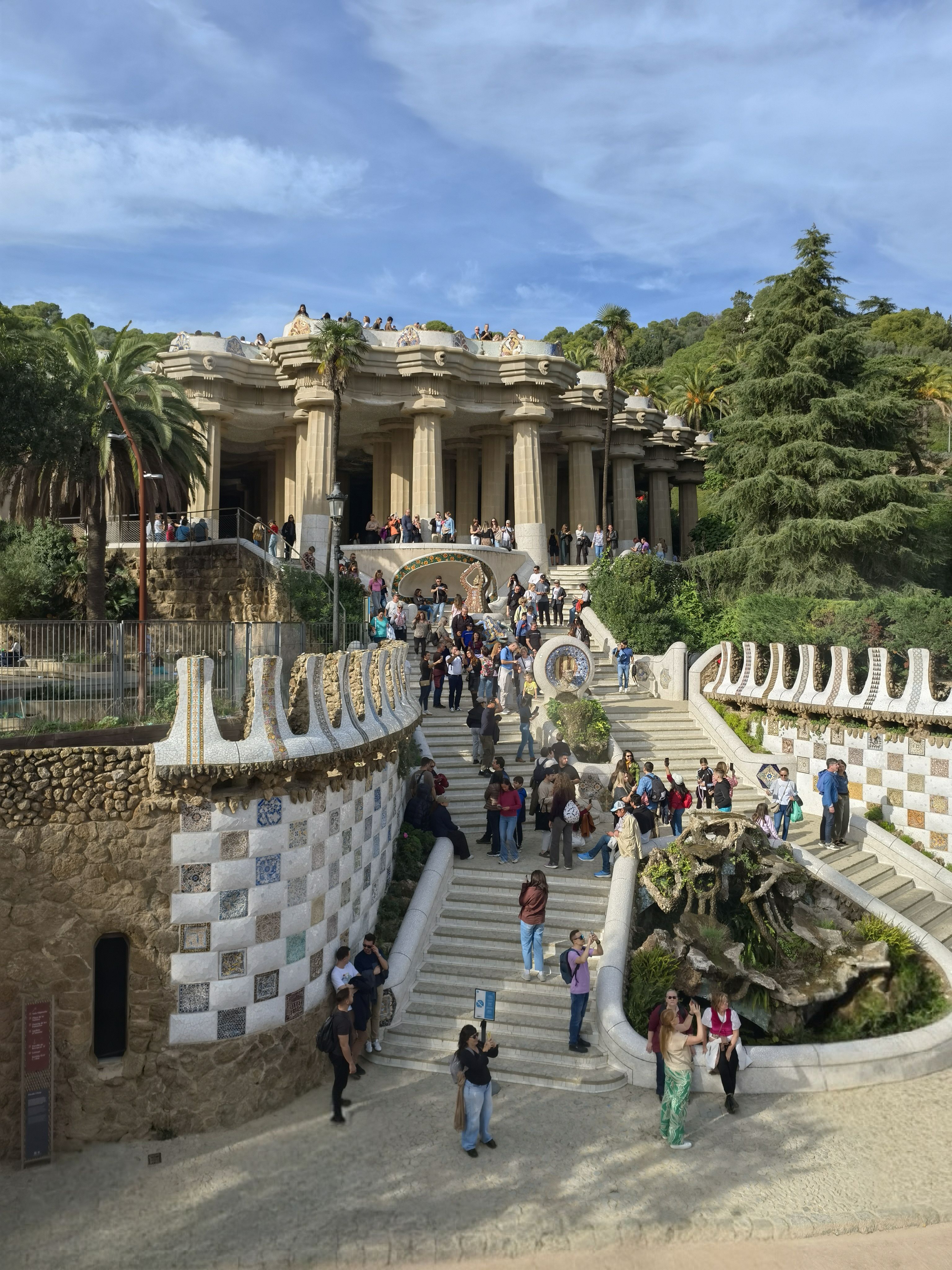 桂尔公园,建于1900年,历时14年,全部由高迪设计建造,被列为世界文化遗产。高迪在此工作生活了19年。依地势而建的高架走廊由86根柱子支撑,环绕一圈的马赛克座椅是全球最长的座椅,独特的波浪形及倾斜结构让人坐起来十分舒适,大门口还有他钟爱的蜥蜴,这里处处彰显着高迪的建筑风格。