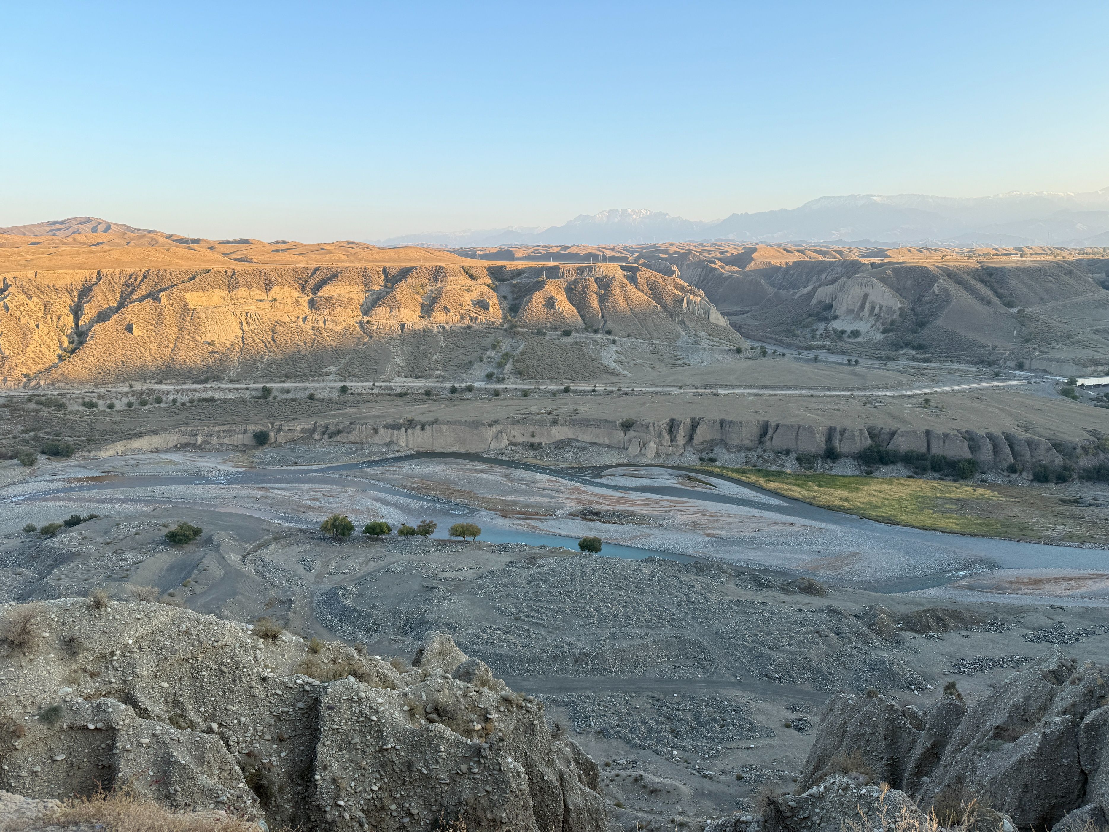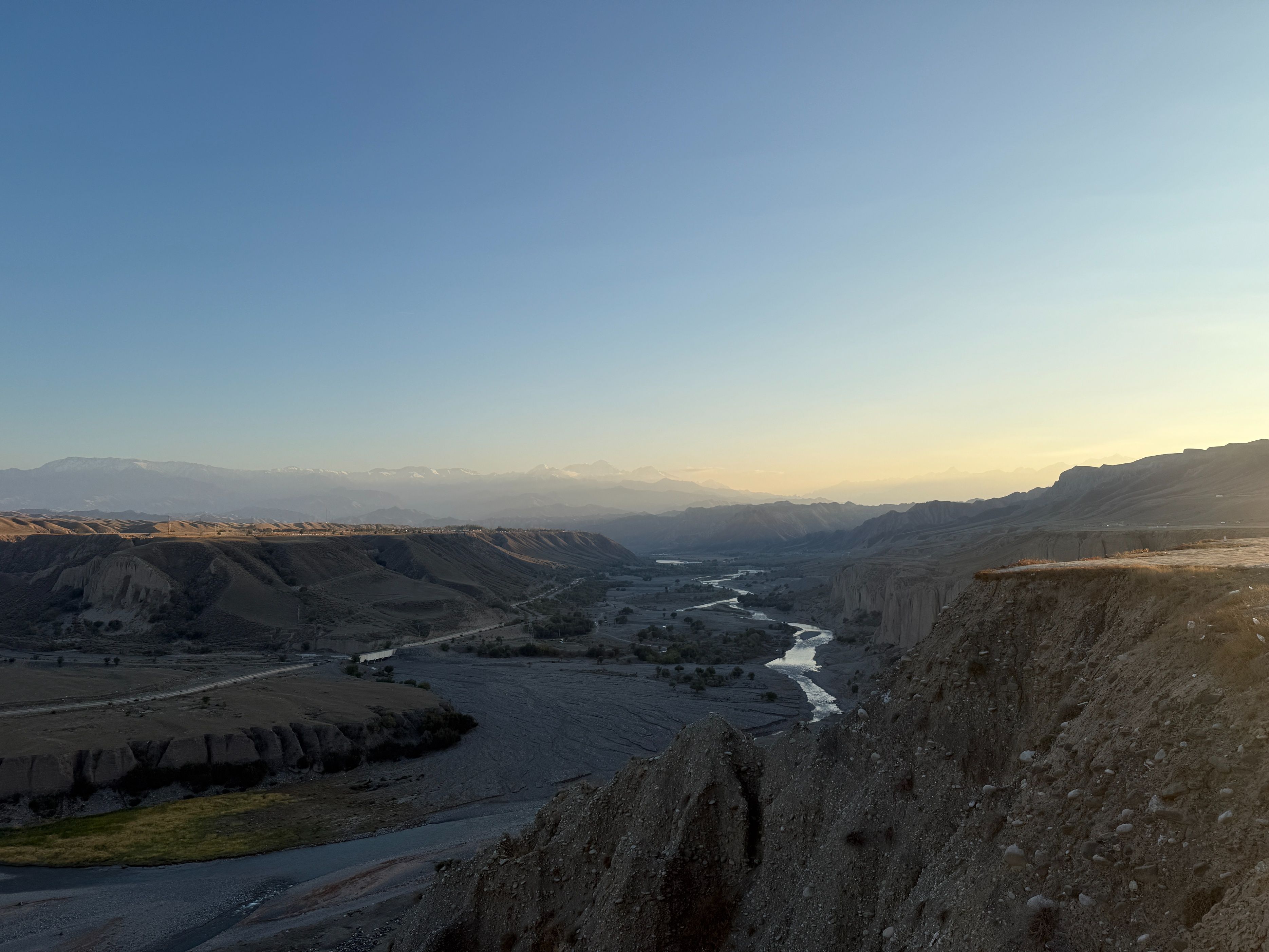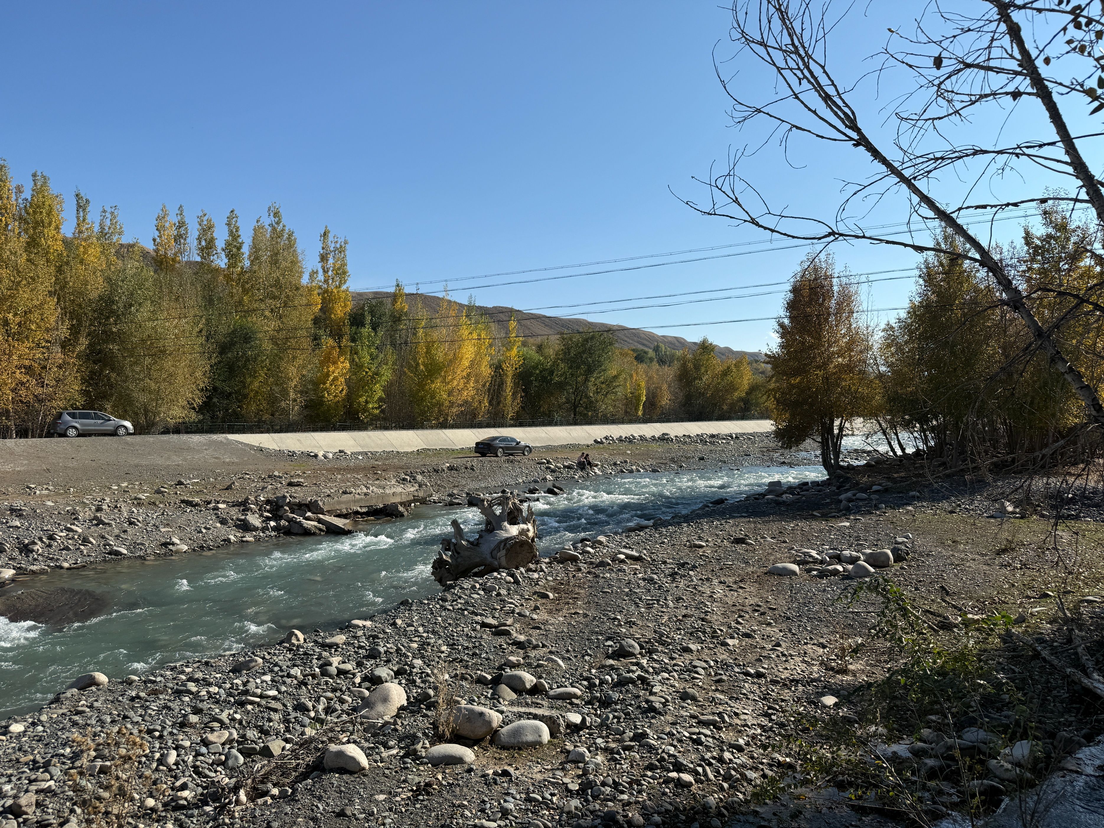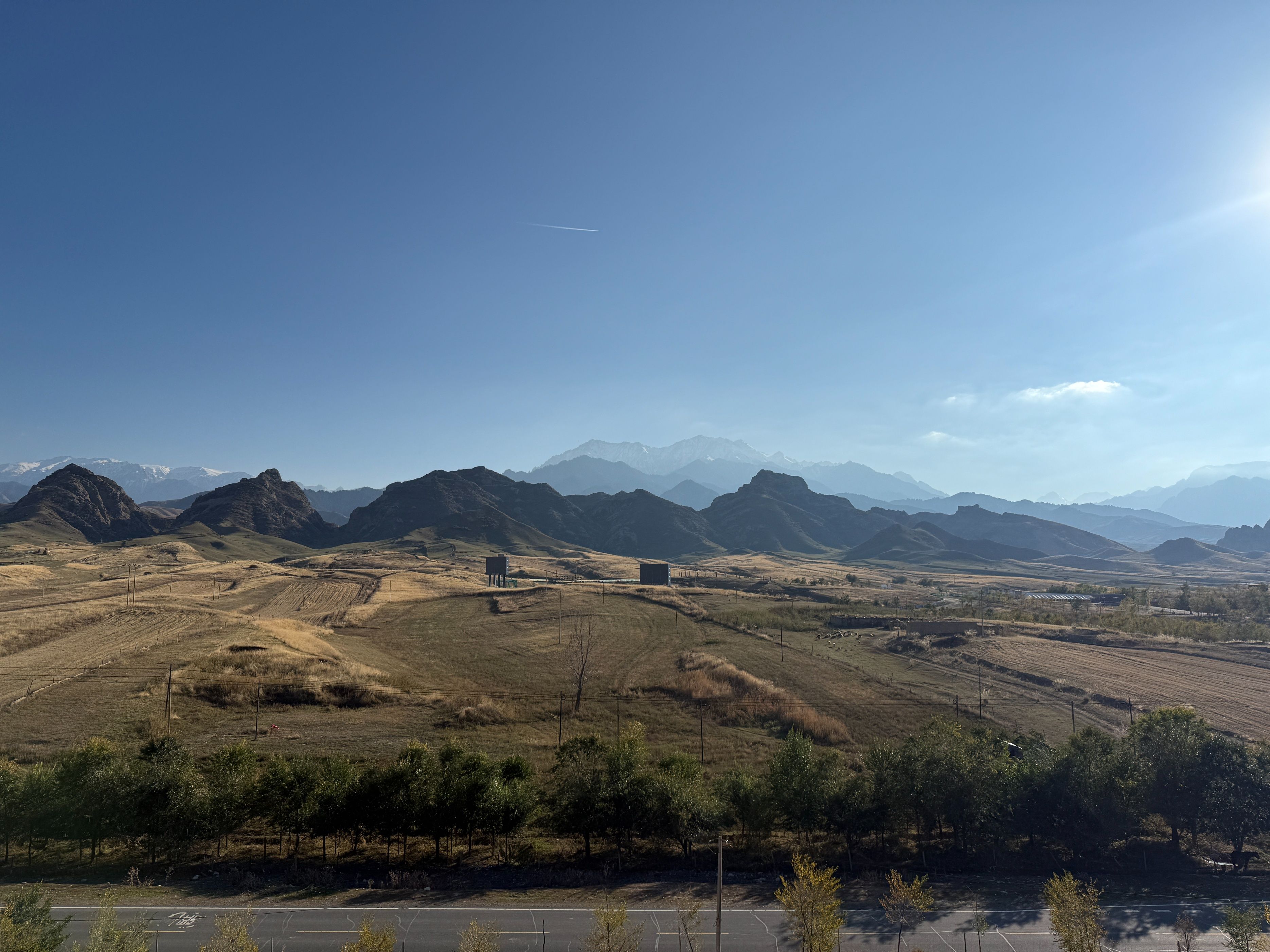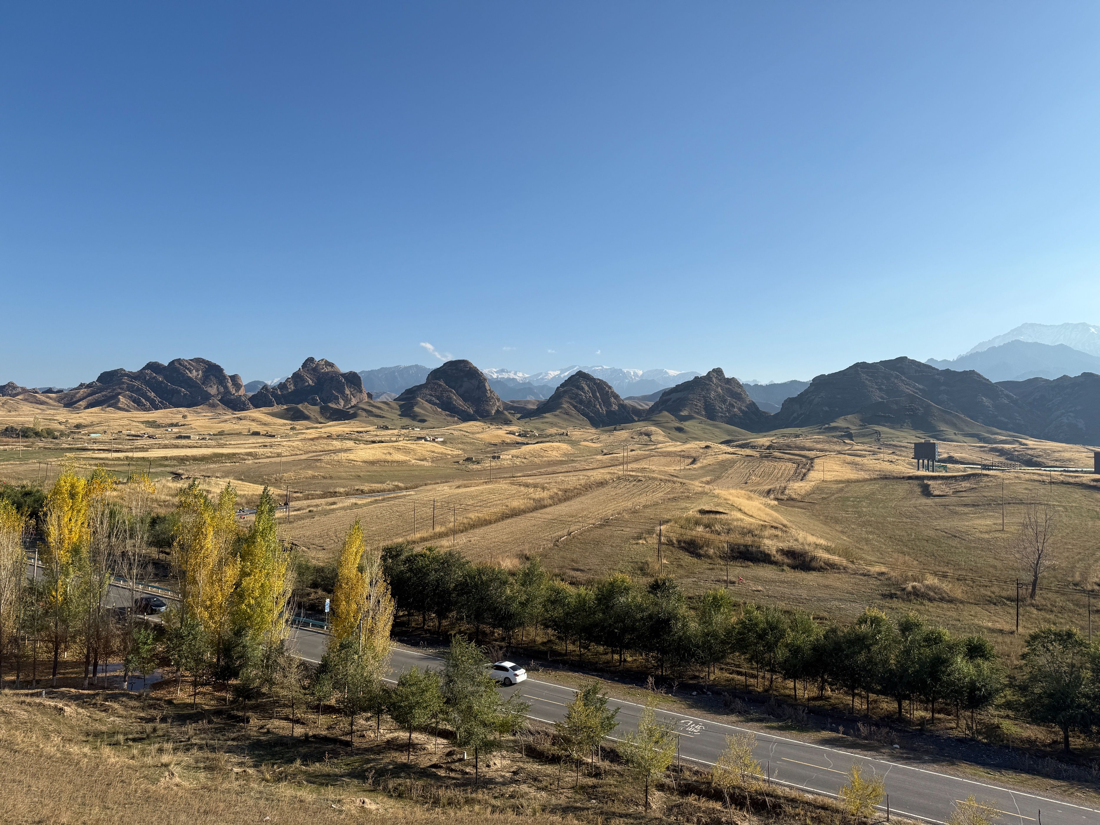 今天从玛纳斯国家森林公园出发,穿越乡道、县道,到达了S101的著名景点:五道垭驿站,在这里休憩了一会儿之后,又向着肯斯瓦特方向开车,回到了石河子,一路上真是风景如画。玛纳斯国家森林公园,高德推荐的地点是神榆台景区,这个地方今天人很多,说实话,略有些名不副实,进去的车流排队有一两公里,景区内的榆树确实壮观,不过此外了无所有。离开森林公园之后,我们从乡道倒到县道,这一路上有一些水果采摘点,两边地里正在收棉花,路上大车较多,而双车道很窄,开车需要小心一些。甫一进入S101,真是风景如画,有森林河流、丹霞草甸、高山森林……时而行走在河谷,时而行走在山峦,两边美景应接不暇。可能一些人觉得夏天绿树成荫具有美感,但是深秋的时候,两边植物的叶子,颜色深浅错落,草原一眼望去,苍莽广袤,更能给人以视觉的冲击。站在五道垭驿站的观景台,让人不由生出天大人小的感慨。从五道垭向肯斯瓦特的方向,车流慢慢变多,路边的白杨树叶子落了厚厚一片,我们在那里停留了许久,蓝天、白树和黄叶相映成趣,过了林带,有上世纪八九十年代的粮站、小卖部,不过都废弃了,让人不禁生出关于过往的遐思。肯斯瓦特人很多,执勤的警察忙着指挥,因为不好停车,我们没做停留。过了这里,有几个可以露营的驿站,采用帐篷出租的形式,我夏天来的时候,有一些人在那里过夜看星星,天气冷了,问津的人不多。今天虽然只走了一小部分S101的道路,但是还是被它的苍莽美感征服,推荐大家有空,尽可以去自驾,享受山间明月江山清风。