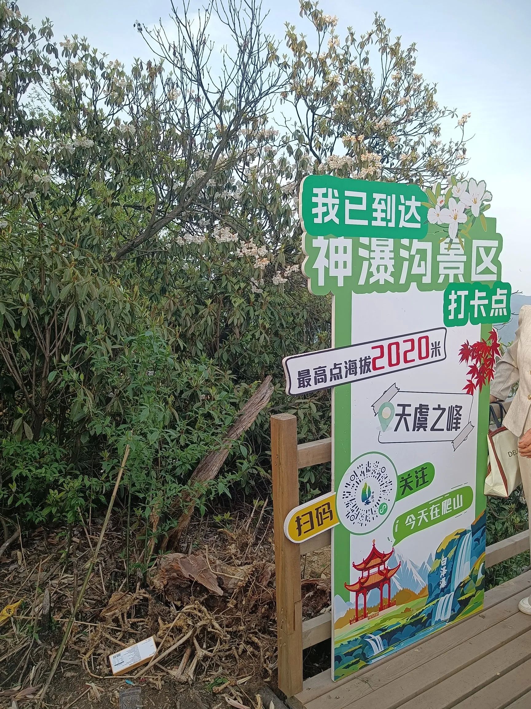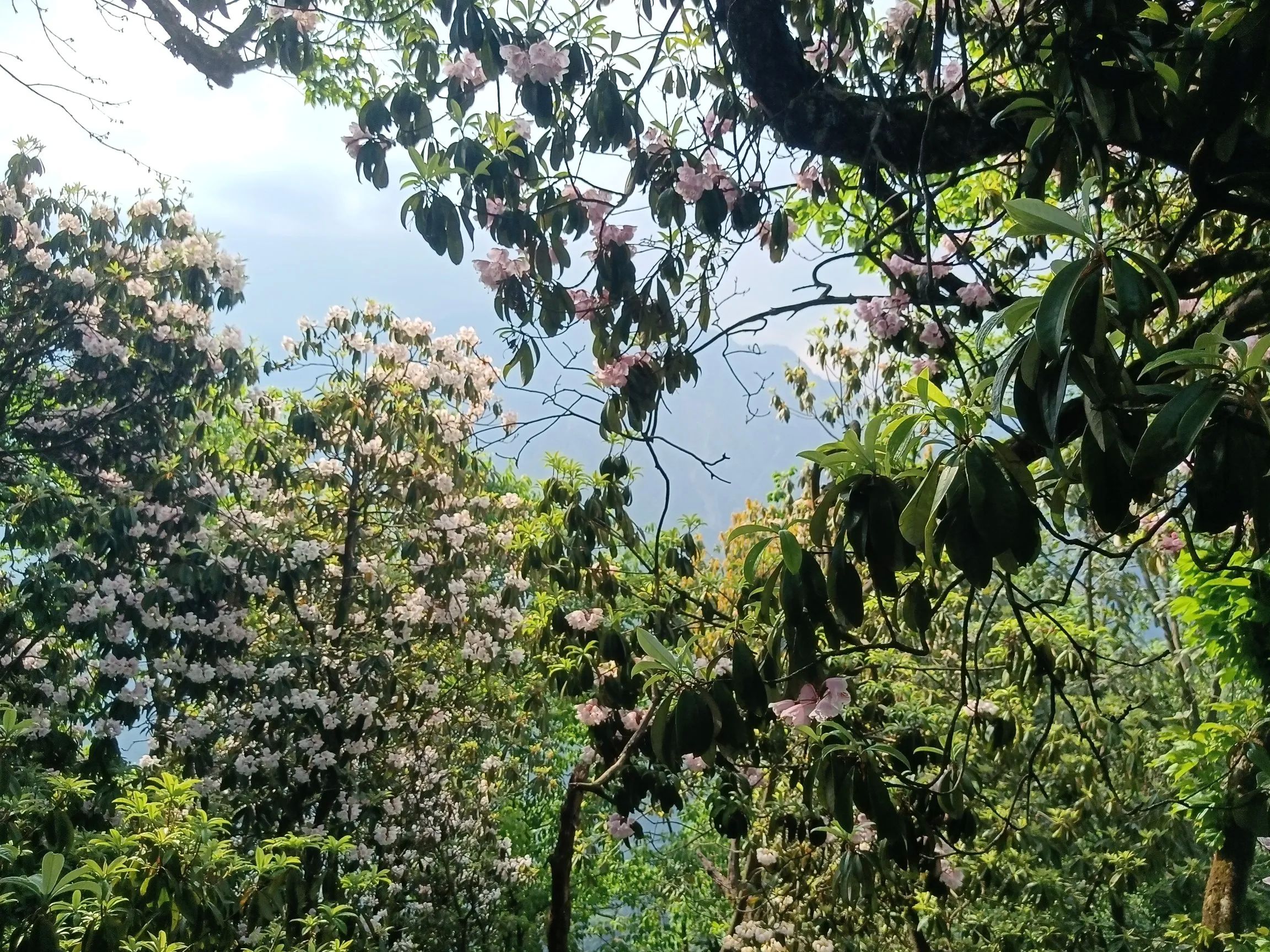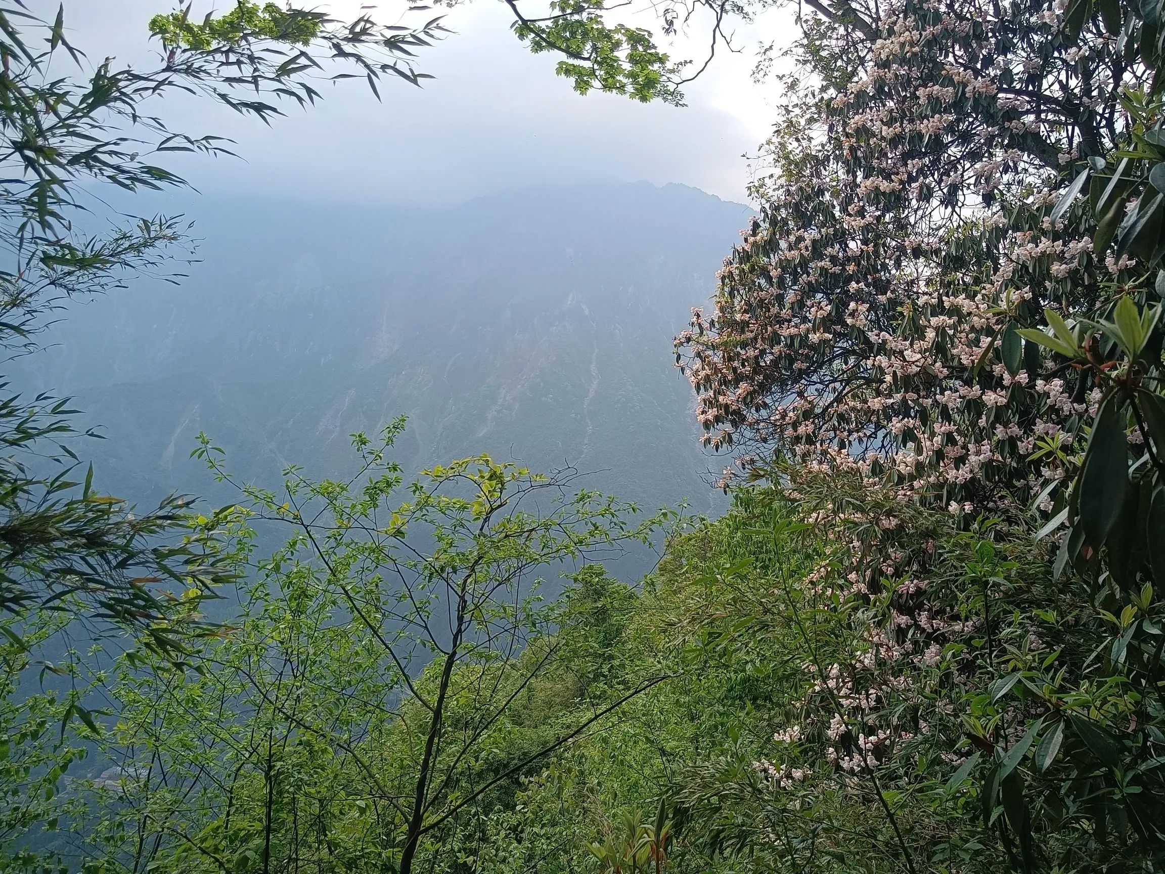 观光车的终点玻璃栈道才是真正徒步的起点,至天虞峰(海拔2020),再绕行至后山山门,至少需要六个小时!杜鹃花在海拔一千五米以上,有一公里的距离,完全在花海中穿行,珙桐也恰逢花季,白色的鸽子花在风中摇曳,极美!