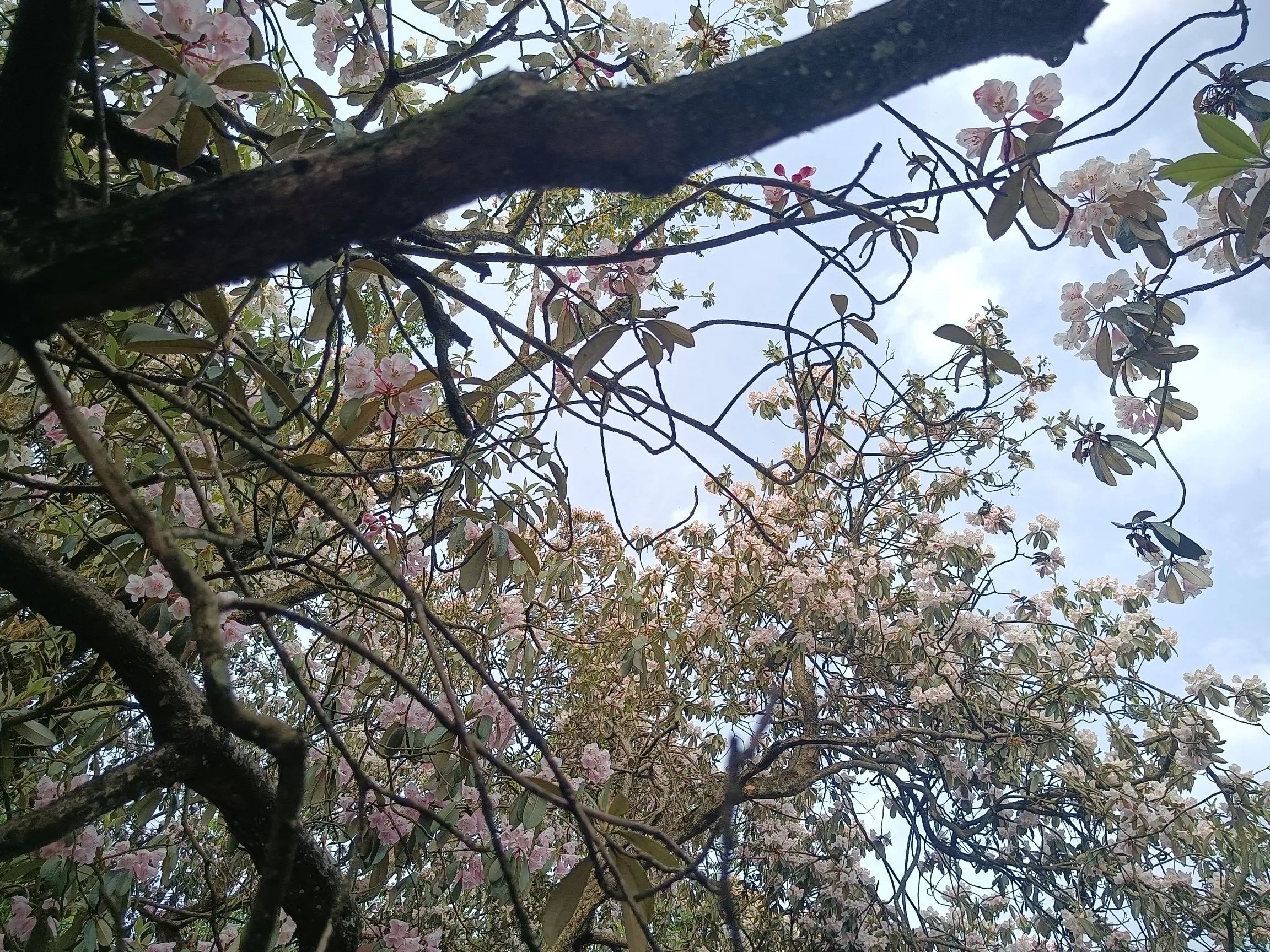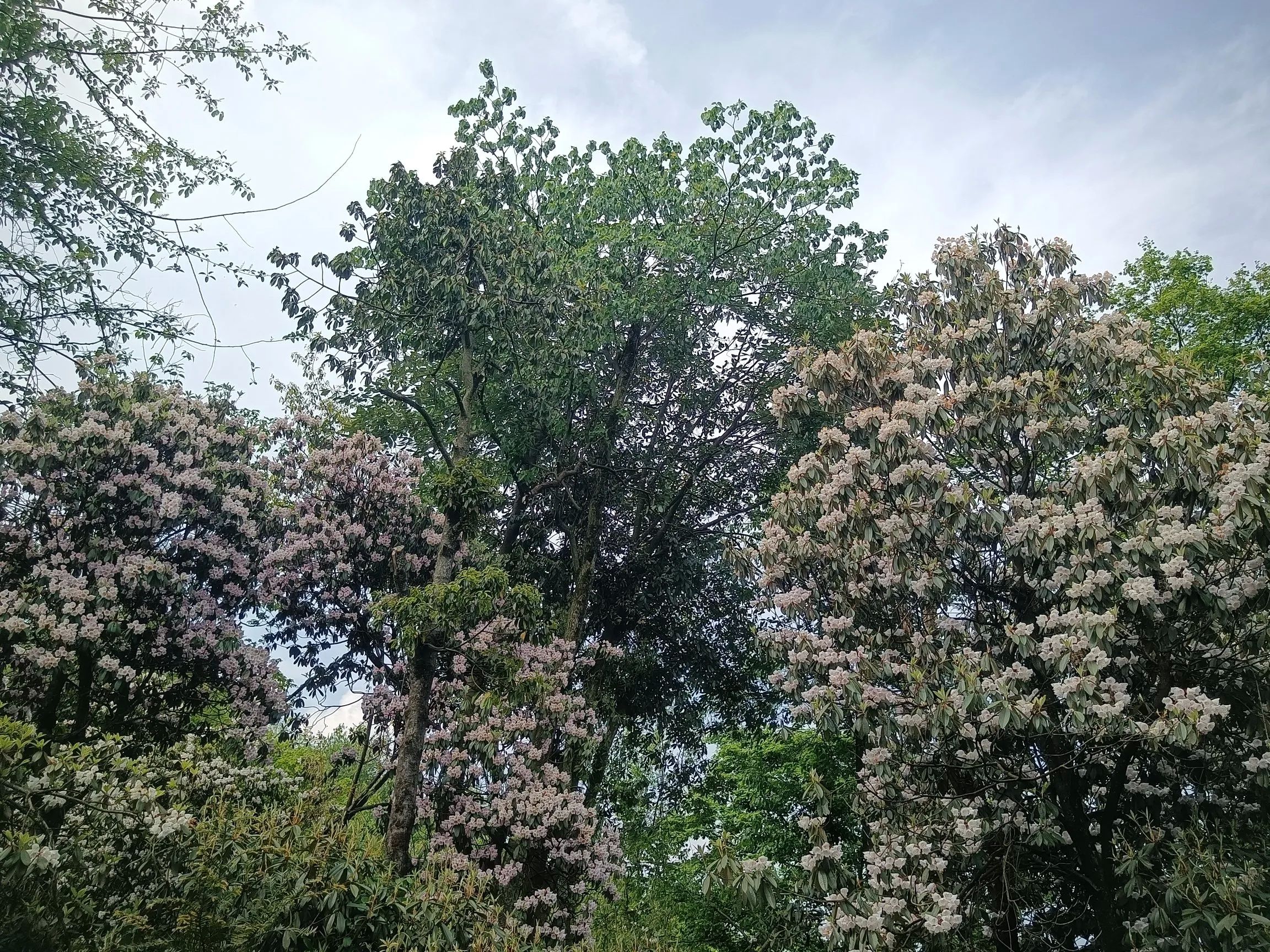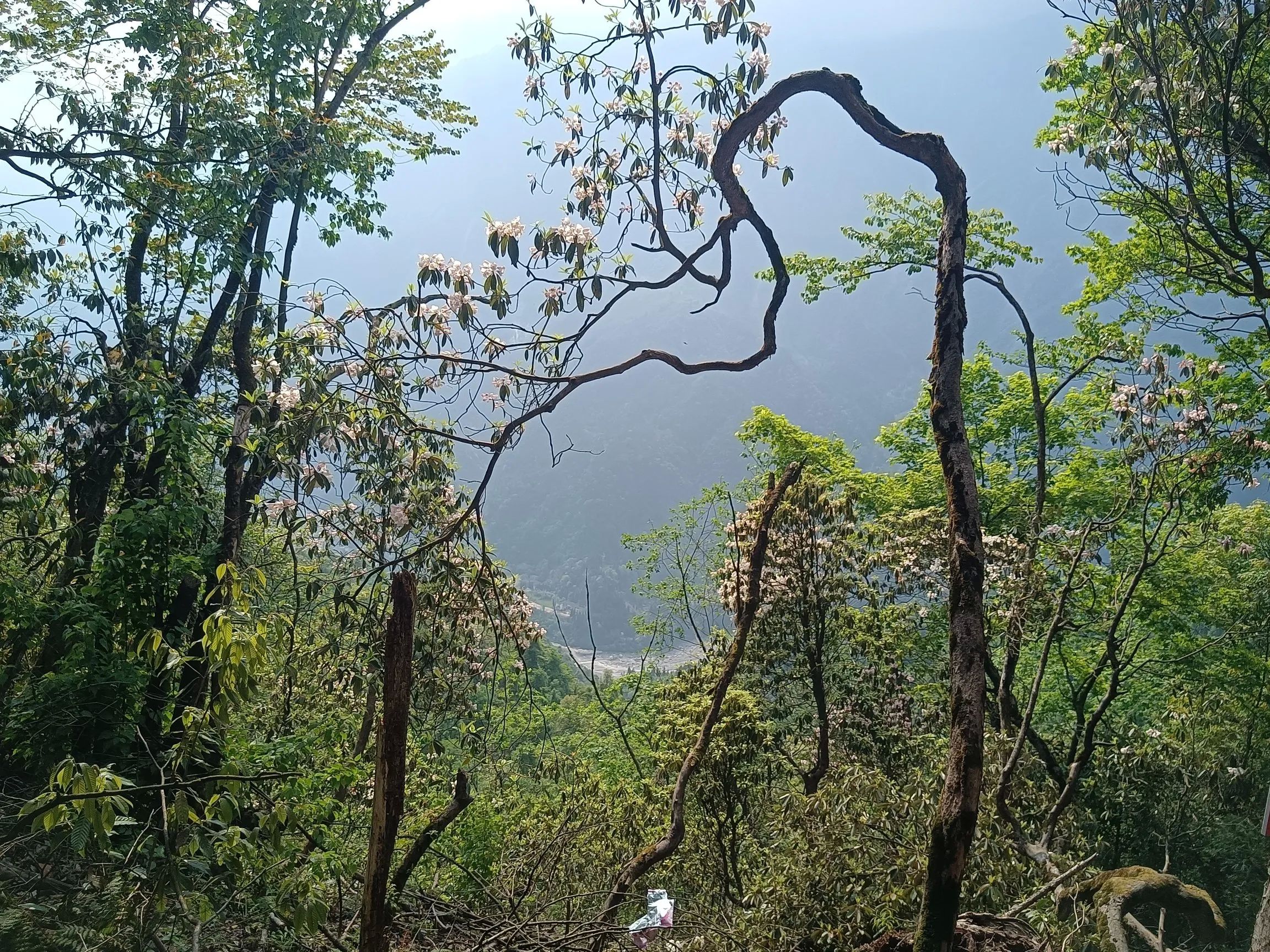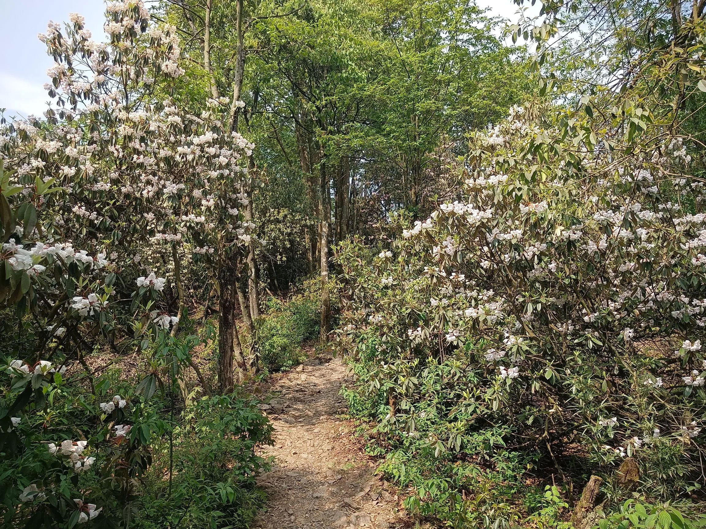 观光车的终点玻璃栈道才是真正徒步的起点,至天虞峰(海拔2020),再绕行至后山山门,至少需要六个小时!杜鹃花在海拔一千五米以上,有一公里的距离,完全在花海中穿行,珙桐也恰逢花季,白色的鸽子花在风中摇曳,极美!