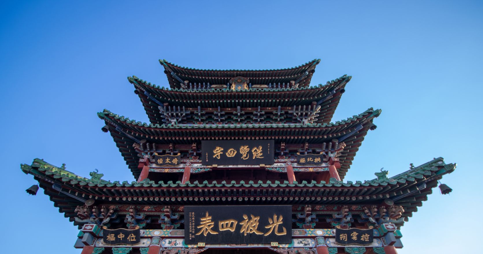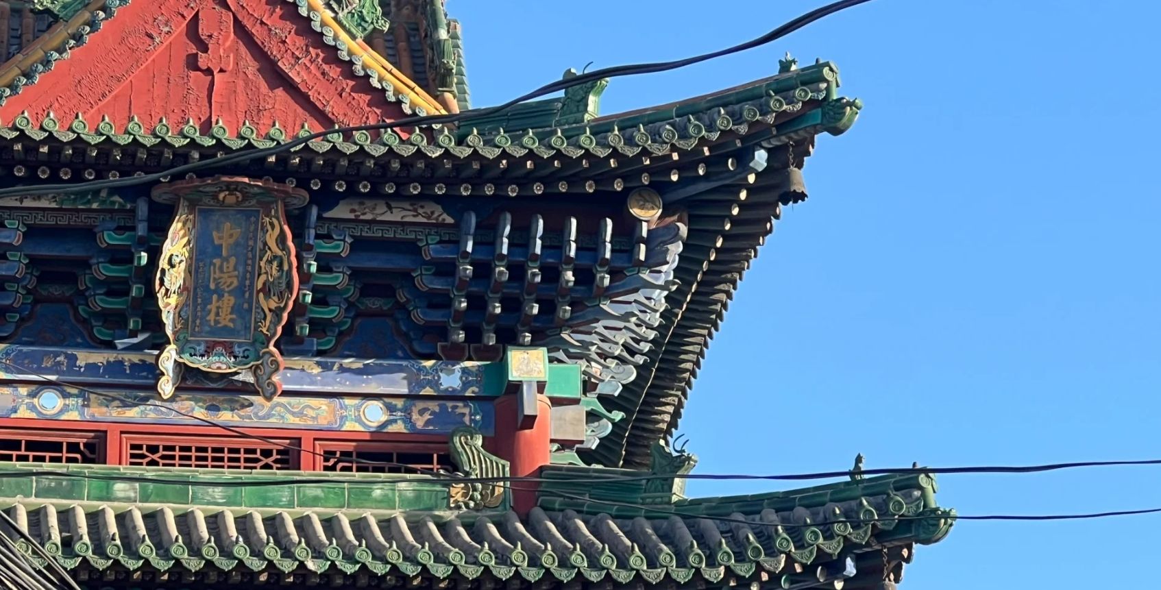 始建于汉魏,清代重建的全木结构楼阁,琉璃瓦顶在阳光下超亮眼。