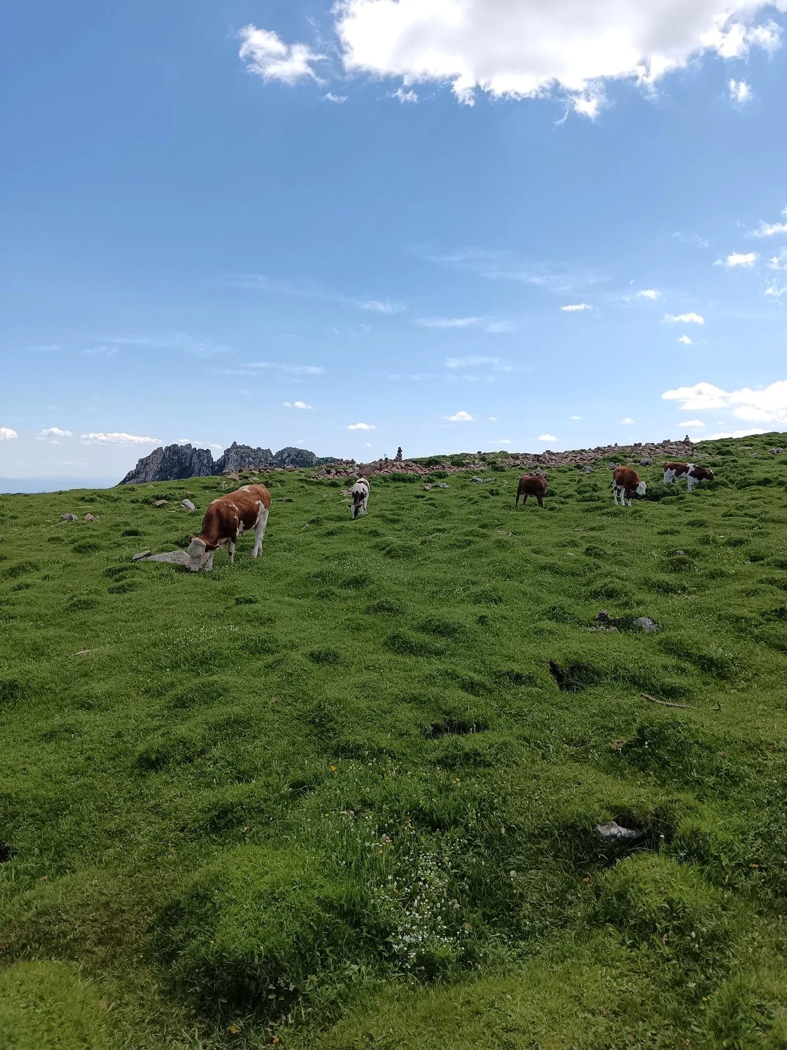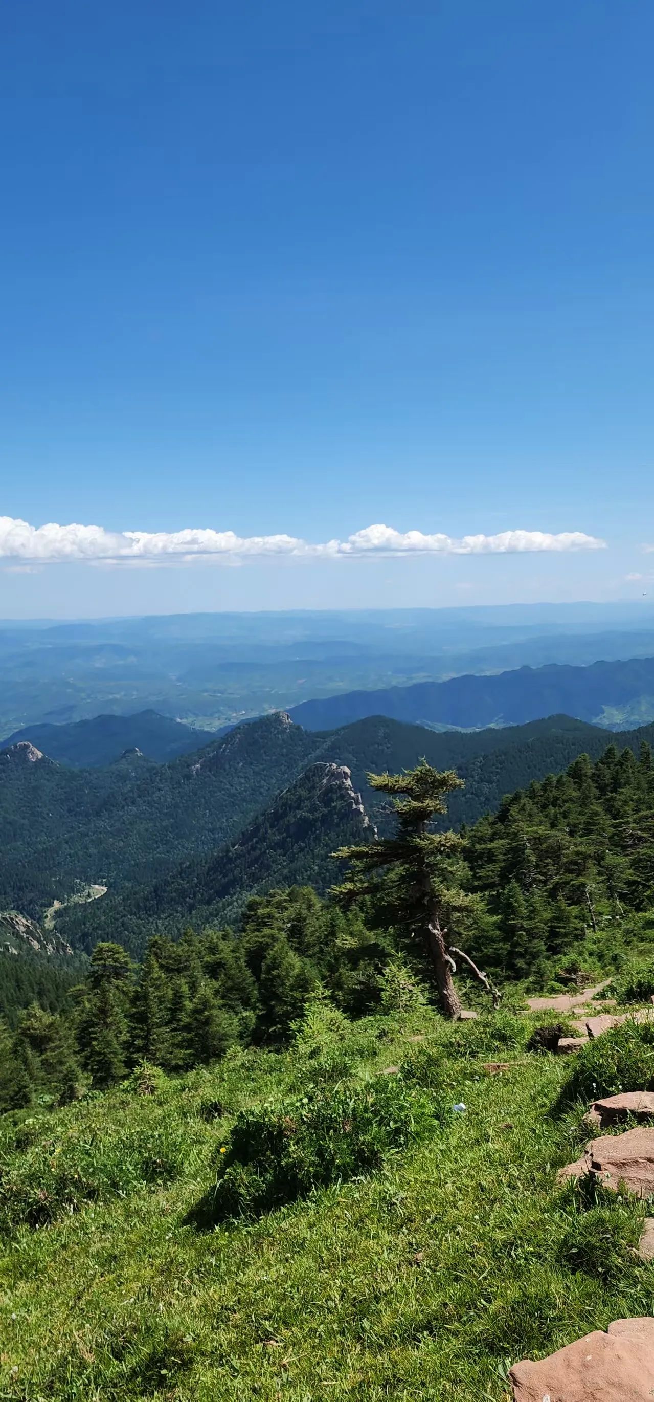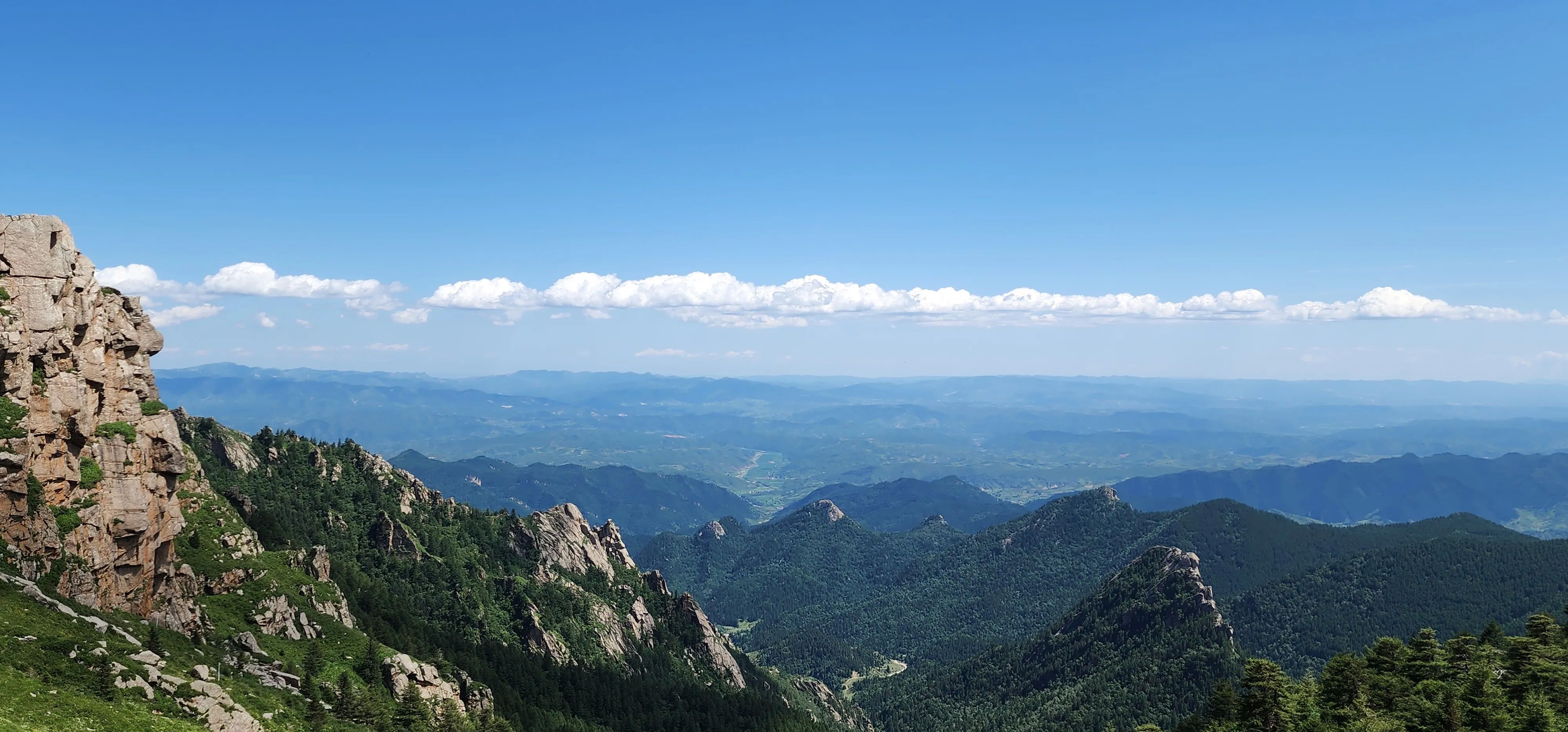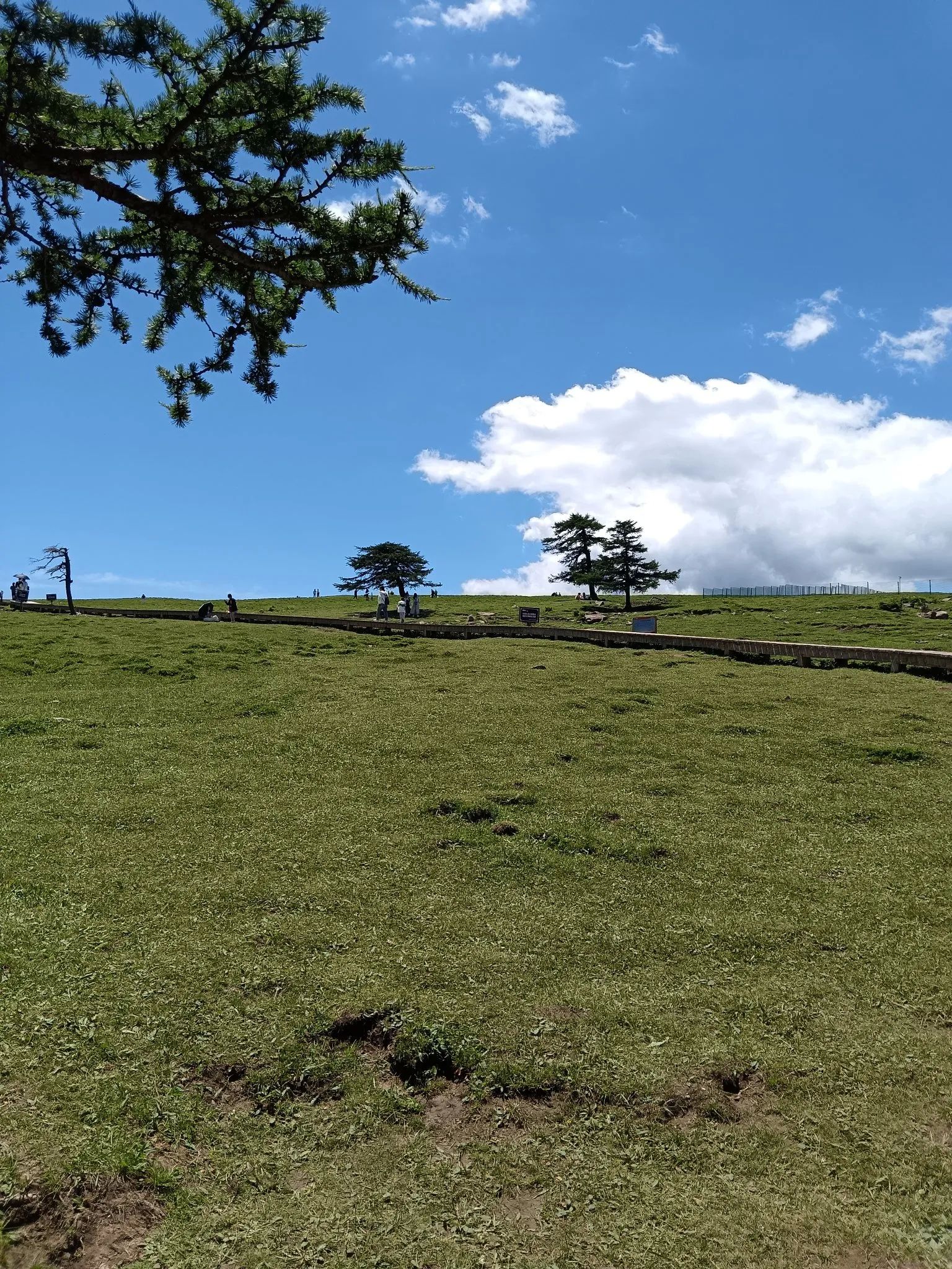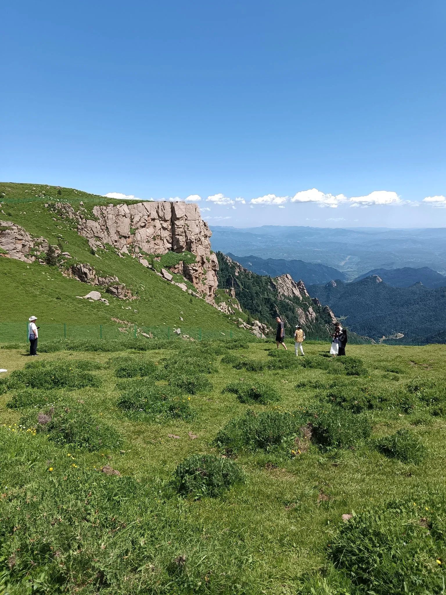 登山的路程不算长,中途不休息的话估计20分钟就能穿过林地登上山顶草原。虽然登山途中景色也不错,让人忍不住停下来拍照。但踏上一望无际的高山草原时,眼前的景色实在令人神往。再加上天气适宜,天蓝云白草绿,无论朝哪个方向看都是美景。大家都说这趟来得值,想不到山西还有这样的美景。山上温度也正合适,中午时分也就20度左右,长裤短袖再加一件防晒衣刚刚好。