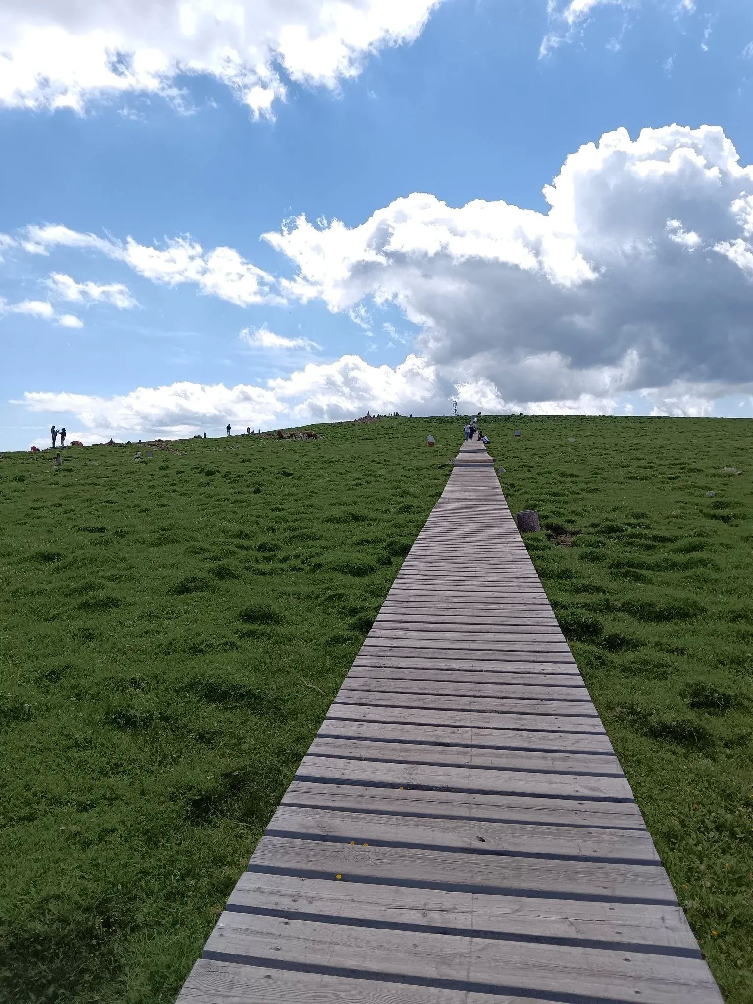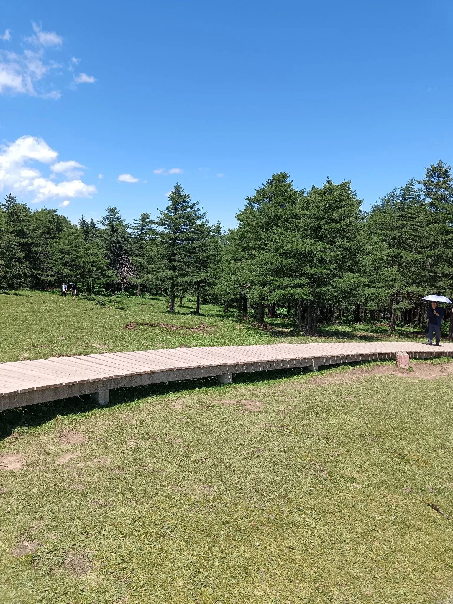 山顶草原有供游人行走的木栈道,沿着栈道缓缓向上,坡度不大,最高点芦芽雄峰就是游玩终点,然后原路返回,到乘车处乘大巴下山。原本计划从马仑草原返回途中再去情人谷看看,没想到下山到情人谷停车场时,车太多已经没有停车位了,路边又不好停车,排队等停车还容易堵车,我们就没去情人谷,直接回县城了,有点小遗憾。