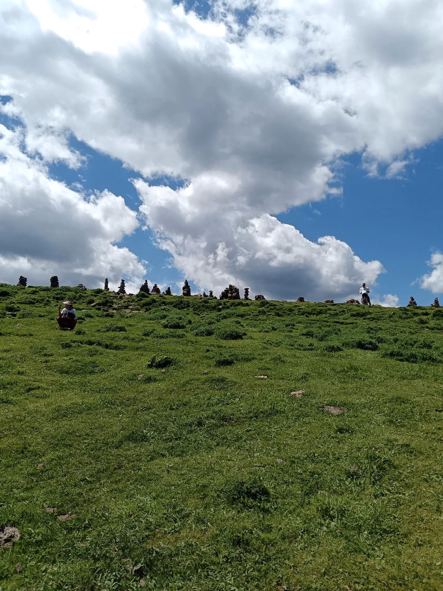 我们17号去马仑草原,出发时间有点晚。去景区的路还算好走,有一段山路弯道较多,但对熟练的司机来说没什么难度。到景区的时候差不多11点了,景区门口的第一停车场已经满了,只能停在第二停车场,步行大概500米到票务中心买票后乘坐景交大巴上山,进了景区山路变得又陡又弯,景区让换乘景交大巴是有道理的,而且上山的路程挺远,大巴开了二十多分钟,25元往返的车票价格真的很划算。
