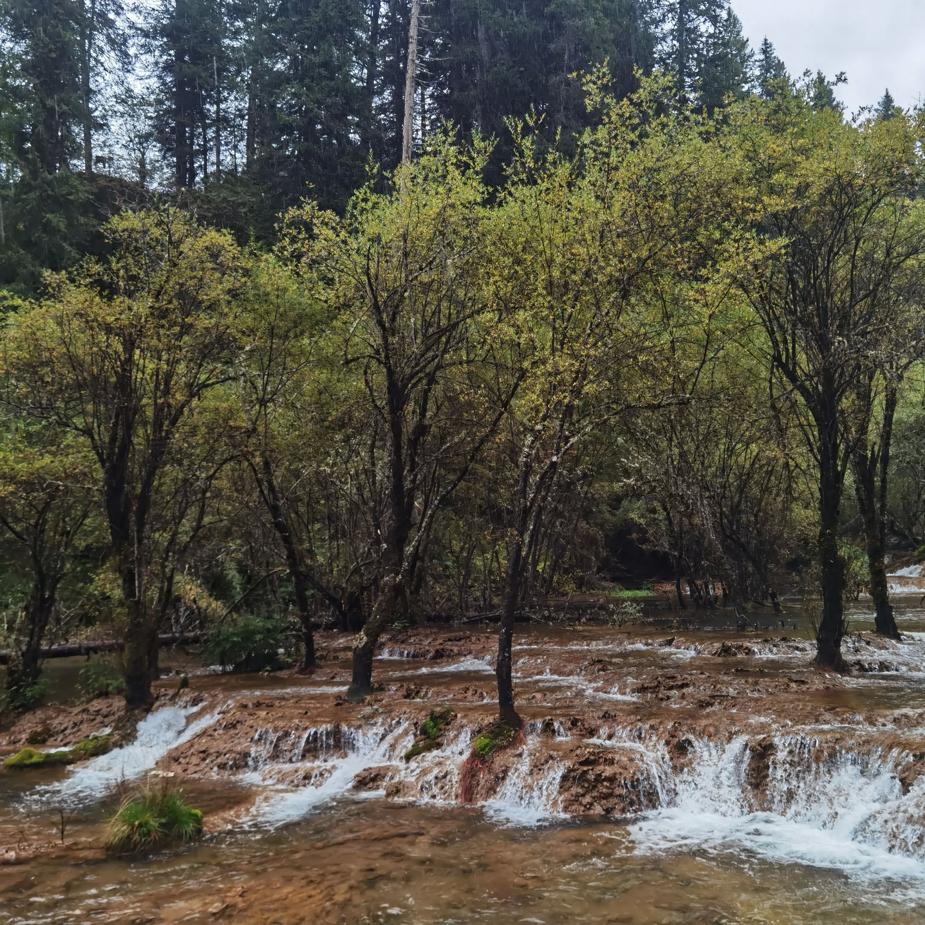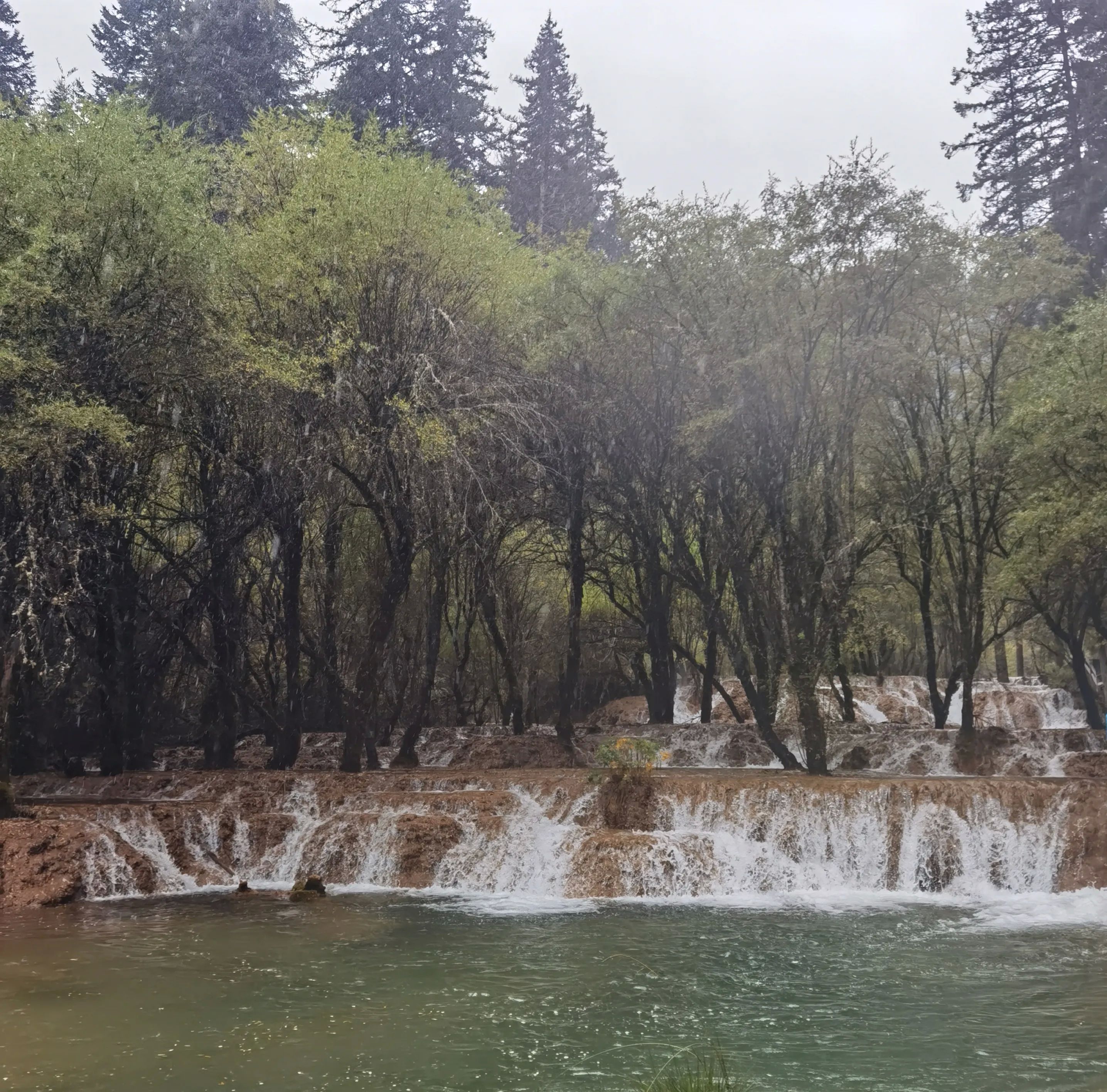 扎嘎瀑布是牟尼沟的“明星景点”。它高104米,宽35米,是中国最高的钙化瀑布。沿着栈道前行,未闻其声,先感其势。水流从陡峭的山壁顶端奔涌而下,如万马奔腾,气势磅礴。瀑布在钙化岩石上层层跌落,溅起层层雪白的水花,在阳光的照耀下,折射出五彩光芒,宛如梦幻的水晶帘。瀑布周围,钙化滩流纵横交错,似天然的浮雕,诉说着岁月的故事。