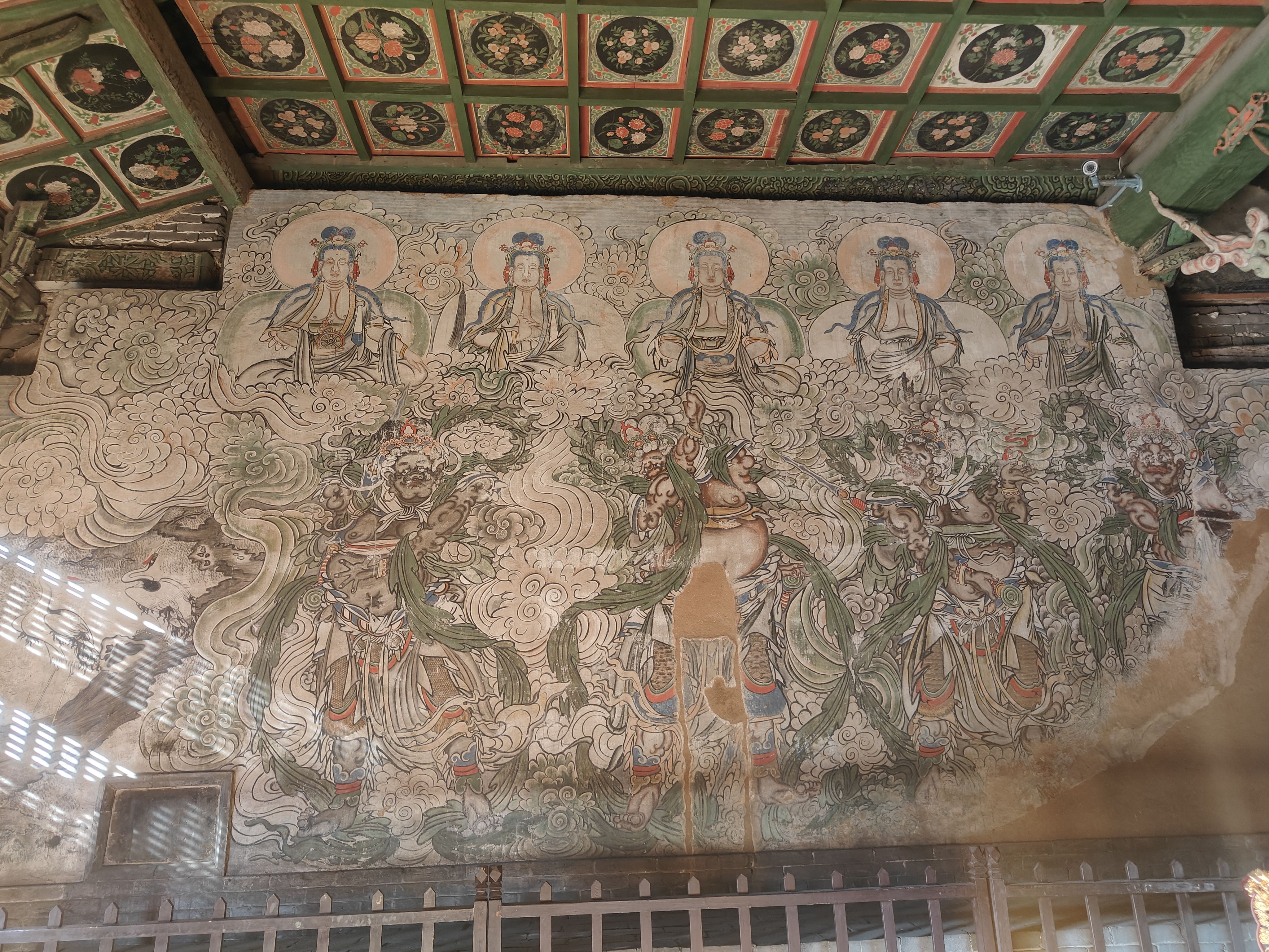 壁画:大雄宝殿、药师殿等殿内的明代壁画技法精湛,题材涵盖佛教故事、儒释道融合元素,如大雄宝殿西壁的《帝后礼佛图》中出现唐太宗与关公形象,体现了明代宗教艺术的多元融合。