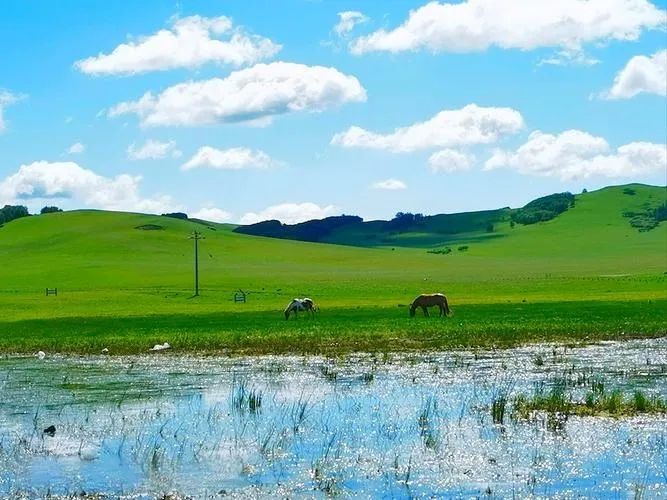 乌兰布统之美,在于其地貌的丰富与色彩的绚烂。广袤无垠的草甸如同巨大的绿色绒毯,铺展向天际线。连绵起伏的丘陵勾勒出柔美流畅的线条,远观犹如凝固的海浪。星罗棋布的海子(湖泊)如蓝宝石般镶嵌其中,倒映着蓝天白云和岸边的白桦林,宁静而圣洁。独特的是,这里兼具草原的辽阔与疏林的秀美,疏朗的白桦树、成片的沙地云杉点缀其间,构成了一幅层次分明、极具视觉冲击力的“欧陆草原”风光画卷,被誉为“摄影家的天堂”和“露天影棚”,《还珠格格》、《康熙王朝》、《汉武大帝》等众多影视作品都曾在此取景。