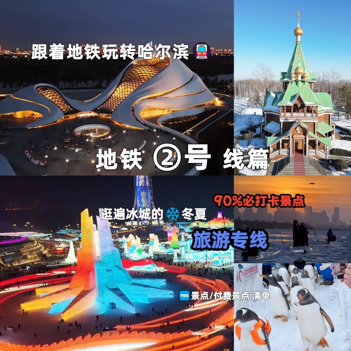 解锁哈尔滨最快玩法地铁串联核心景区清单。#保姆级攻略#一站式游玩#哈尔滨#哈尔滨旅游攻略#哈尔滨自由行 付费景点东北农业大学站:伏尔加庄园(成高子真)、薰衣草庄园(东方红农场)省政府站:龙塔(长江路178号)尚志大街站:索菲亚教堂室内(透龙街88号)哈尔滨冰雪大世站:梦幻冰雪馆、摩天轮等 雪景路1666号 太阳岛站:极地公园、太阳岛冬季雪雕节、太阳岛夏季遇见哈尔滨、太阳岛熊猫馆世贸大道站:波塞冬(汇江路153号)、融创乐园(世贸大道99-1号)、东北虎林园(松北街88号) 博物馆纪念馆南直路站:哈药六版画博物馆(南直路326号)中央大街站:犹太新会堂(犹太人历史文化博物馆)经纬街162号、犹太老会堂(音乐厅)通江街82号、犹太商人索思金故居 经纬四道街30号、哈尔滨市博物馆 柳树街13号 人民广场站:哈尔滨城市规划馆 友谊路369号哈尔滨站站(哈尔滨站南广场):安重根纪念馆 哈站南广场进站大厅西侧、东北烈士纪念馆 一曼街241号 太阳岛站:黑龙江省科技馆 太阳大道1458号、黑龙江省博物馆(新馆,暂未开馆) 松北天马街江北大学城站:呼兰萧红故居 萧红大道226号 历史建筑游览省博物馆站:红军街、颐园街、阿什河街、果戈里大街、东大直街、西大直街周边历史建筑 工人文化宫站:圣阿列克谢耶夫教堂 士课街与革新街交口 中央大街站:中央大街步行街 中央大街1号、防洪纪念塔 友谊路259号、玫瑰中学旧址(中东铁路竞技俱乐部)上游街69号 尚志大街站:索菲亚广场 透龙街88号、哈尔滨市第一中学(鲁人旅哈国民学校旧址)兆麟街121号、兆麟小学(桃山小学)地段街198号 哈尔滨站站:北广场:圣伊维尔教堂、亚斯利孤儿院旧址 哈尔滨站北广场内、侵华日军岗楼旧址 道理警校胡同 南广场:中东铁路总医院旧址(哈医大四院)颐园街37号、龙门大厦贵宾楼旧址、日本领事馆旧址等 江北大学城站:呼兰天主教堂 呼兰亿兴街与东府路交口 烟火气体验(可手机导航):省博物馆站:南岗(奋斗副食)菜市场 建设街92号、秋林公司 东大直街319号工人文化宫站:革新街市场中央大街站:红专街早市尚志大街站:道理菜市场江北大学城站:学院路志华夜市 冰雪及自然体验太阳岛夏季免费、冰雪大世界夏季啤酒节免费入场、钻石海世贸大道站:哈尔滨大剧