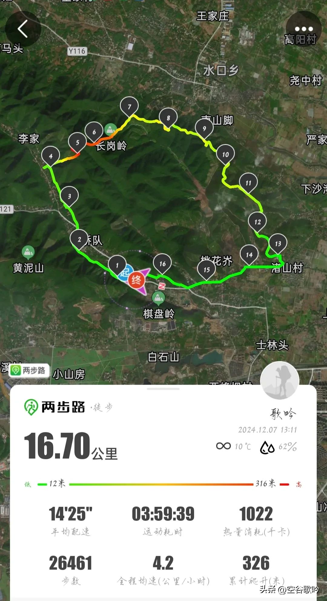全程走了16公里多,累计爬升约326米,耗时约4个小时。