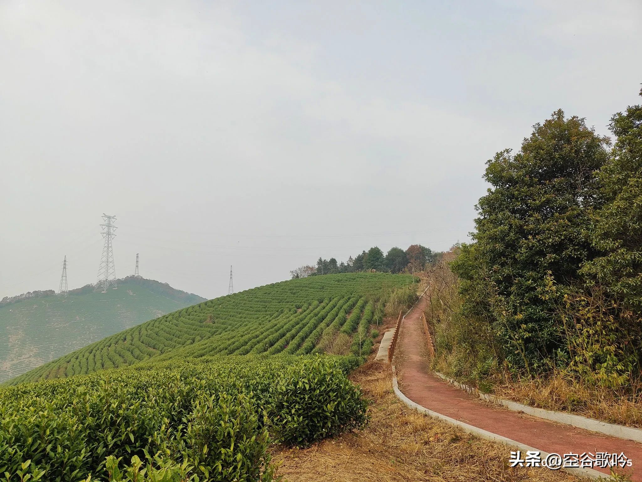 穿越采茶园抵达山顶,沿山顶步道继续前行,坡度相对平缓,虽然仍有一些上下坡路段,但总体是下行。经过长岗岭、馒头山、老虎山,到达桃花岭。