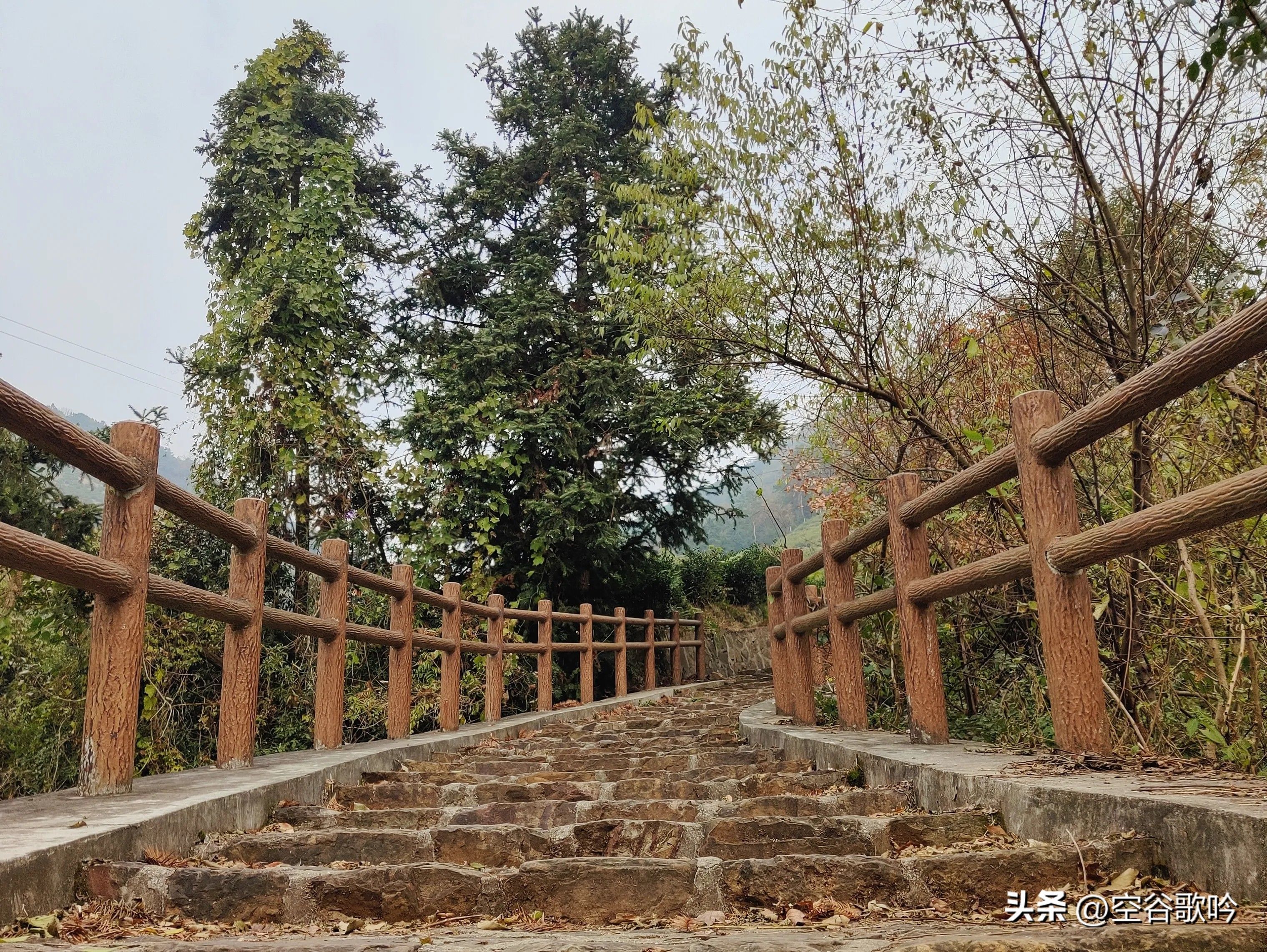 这里开始有一段山路,大约有1公里左右的石阶沿着山坡的茶园连续向上直至山顶,名为“百步云梯”,这也是全程最耗体力的一段。