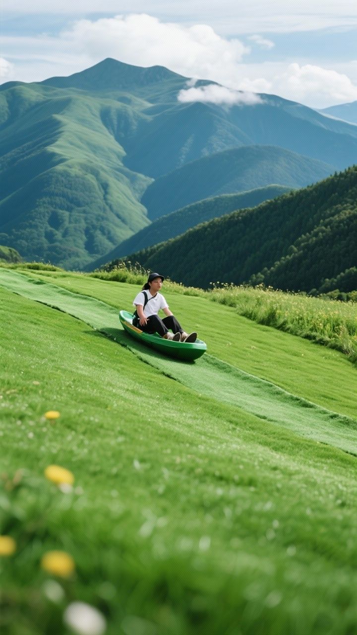 我们清晨出发,自驾1.8小时,沿蜿蜒山路攀升,当车窗外的城镇渐远、山色渐浓,心也跟着轻盈起来。抵达景区后,换上轻便装备,直奔滑草场——坐上滑垫,双手一撑,瞬间如离弦之箭冲下山坡!风在耳边呼啸,绿浪在身侧翻滚,尖叫与笑声洒满整片山谷。胆大的还可挑战高空玻璃水滑道,夏日泼水嬉戏,秋冬乘滑道穿越丛林,惊险又畅快。