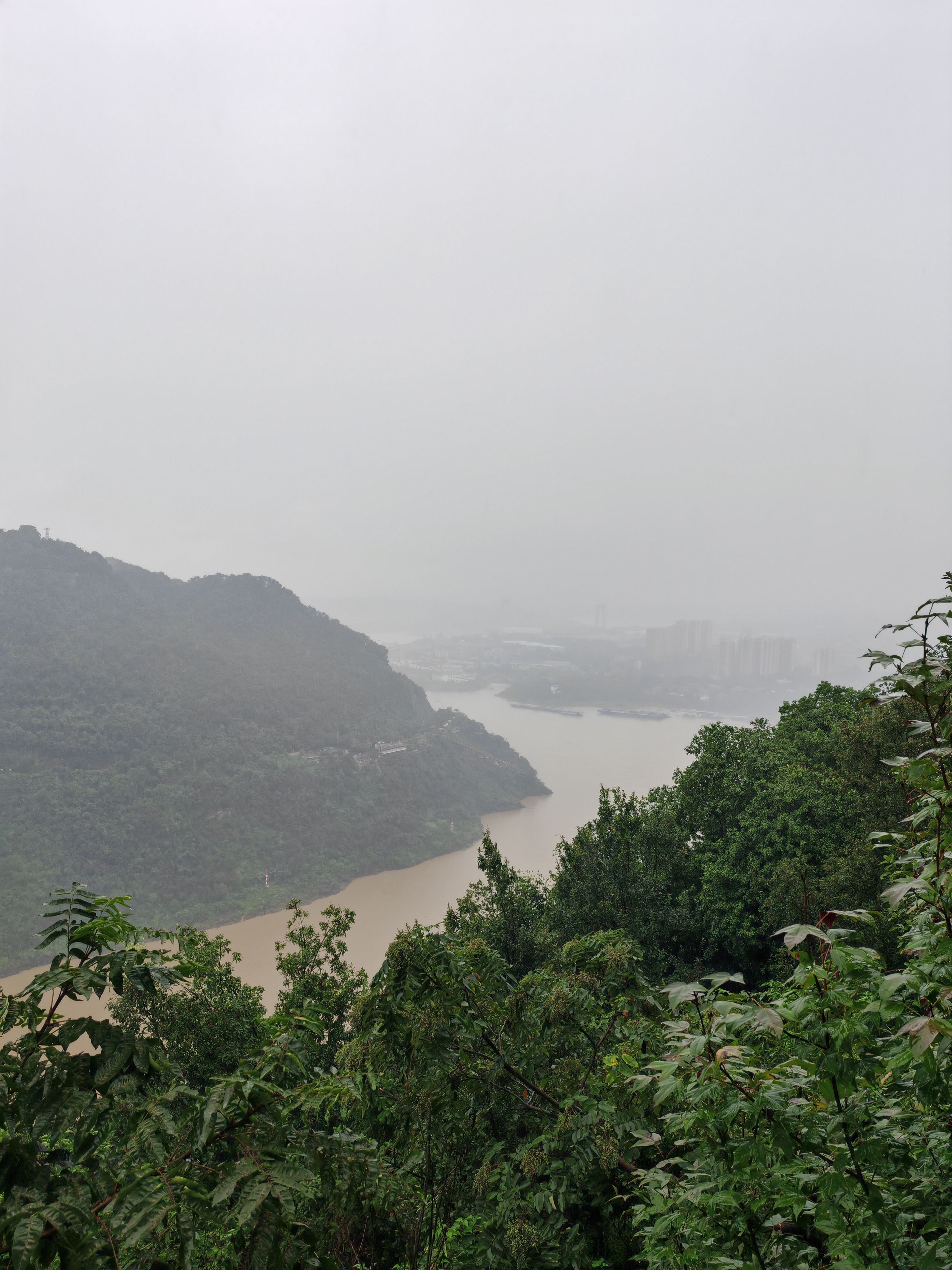 立于海拔470米的悬崖峭壁上,俯瞰烟雨云雾中的铜锣峡,长约3公里,江面狭窄、水流湍急,两岸悬崖夹江对峙,悬崖高立数百米,确是长江三峡中最为险峻的段落之一,为溯江而上进入重庆城区的水路门户,名副其实素有“东陲屏障”之称。