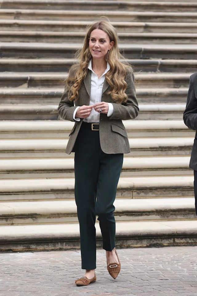 现场照片显示,凯特身穿一件剪裁得体的西装外套,内搭一件简洁的白色衬衫,下穿长裤,整个人看起来干练又优雅,雨中漫步更是增添了几分浪漫氛围。
