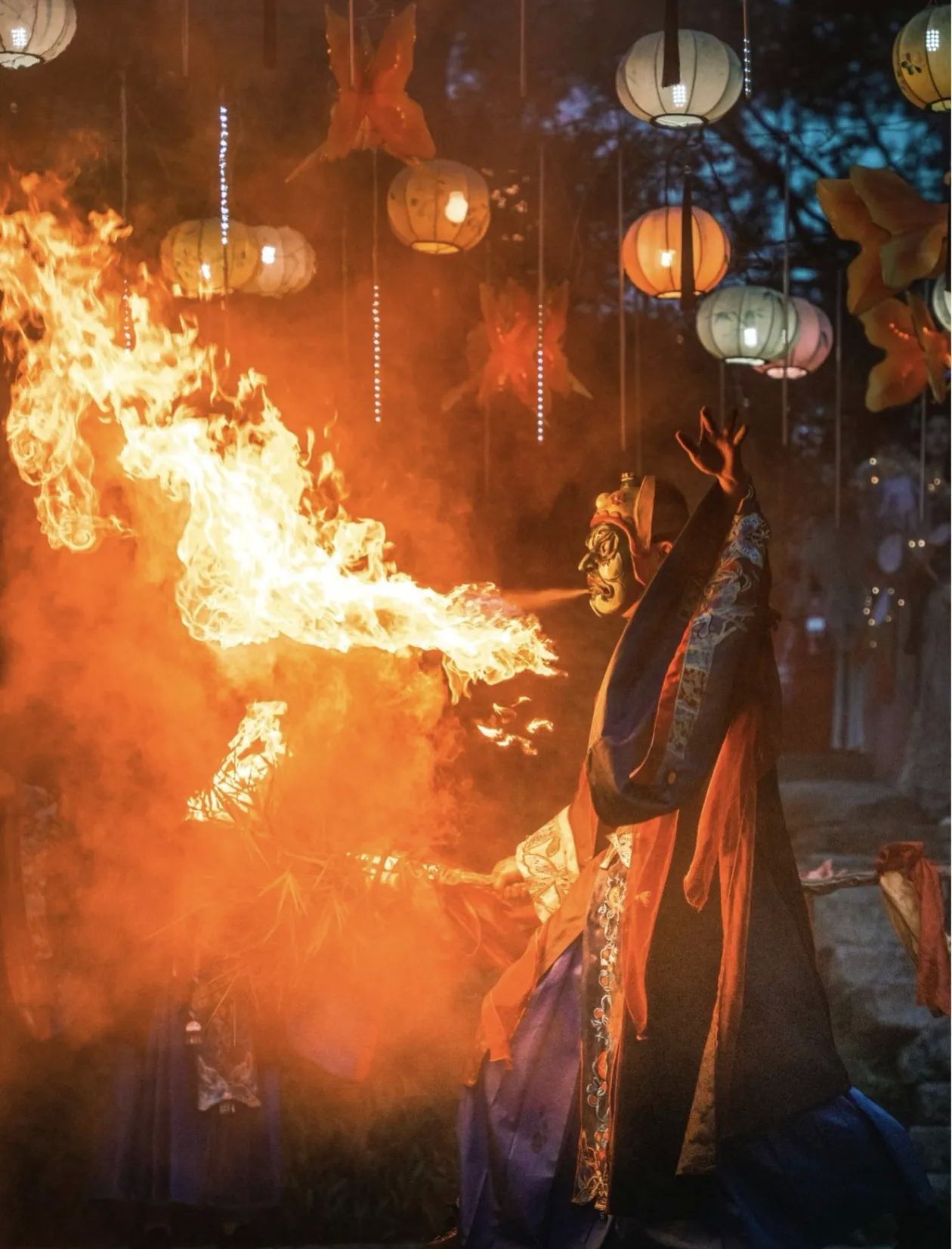 中秋/国庆等节假日,还会有非遗火壶,打铁花,飞天凤凰,皮影戏等限时表演。