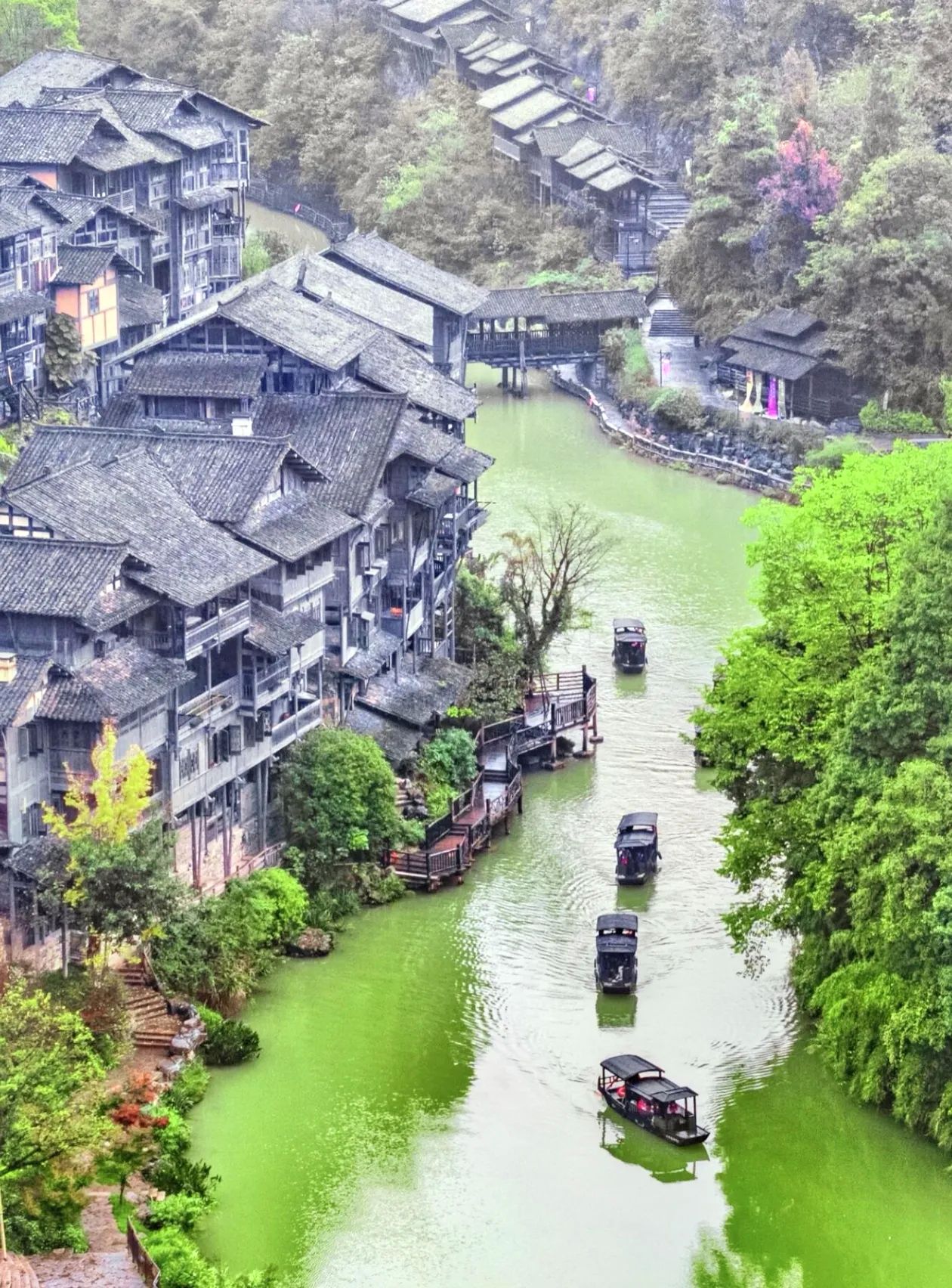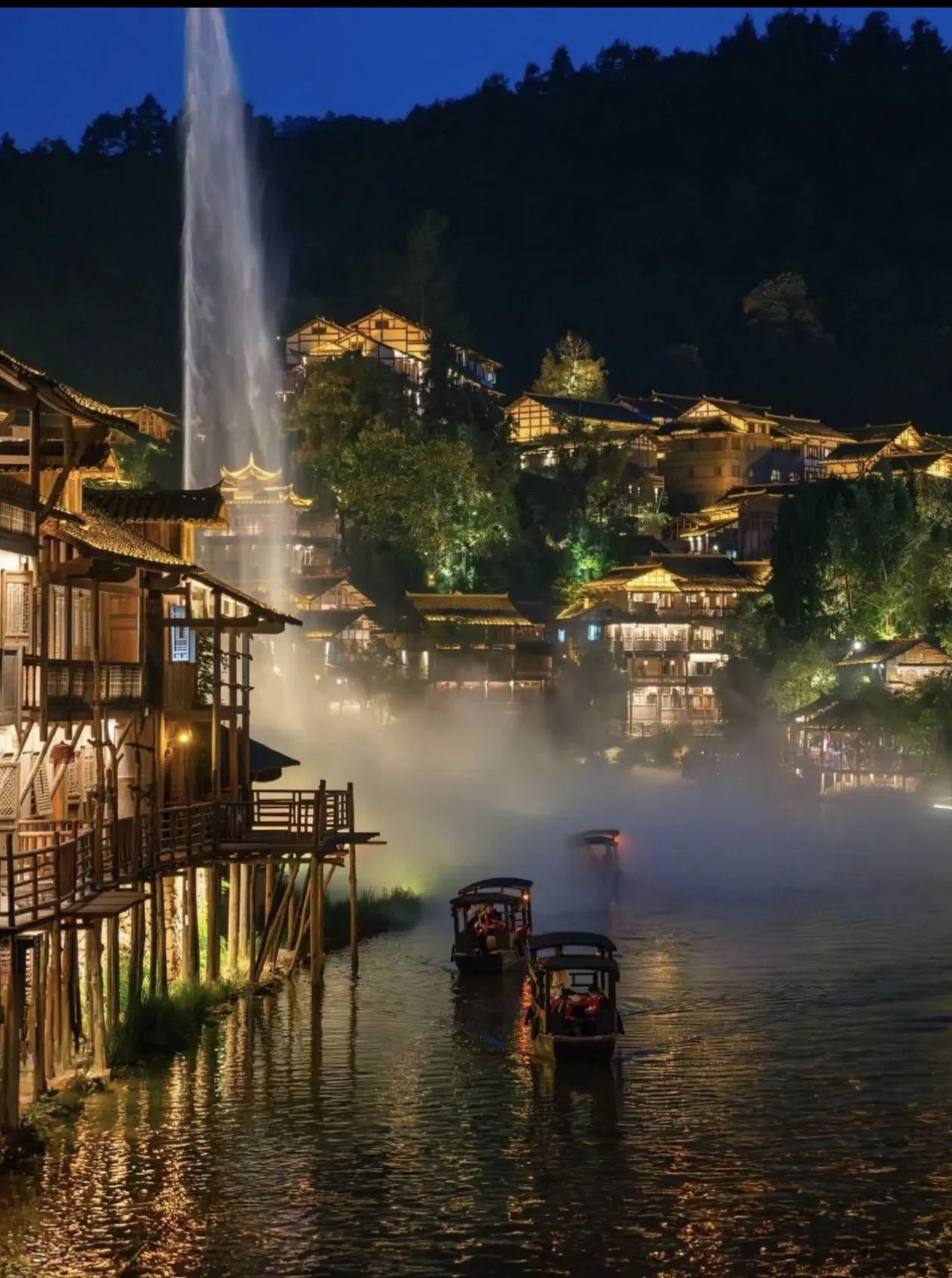 乌江寨名字听起来原生态,其实建筑是纯现代的。青石黛瓦、石板小巷,都是仿古建筑。这里有壮丽的乌江画卷,山林环绕、云烟袅袅、远离尘嚣。坐摇橹船看烟雾弥漫,夜游古村观灯火璀璨,无论是山水之趣,还是文化之韵,都能给人留下难忘的时光。