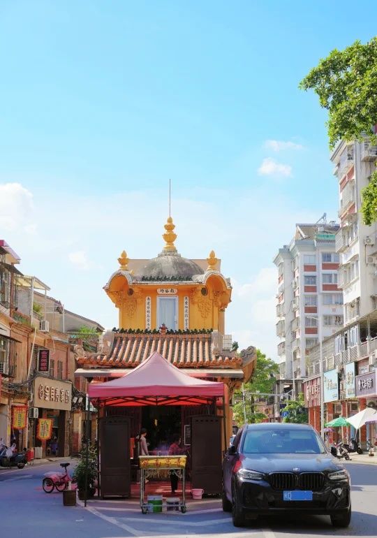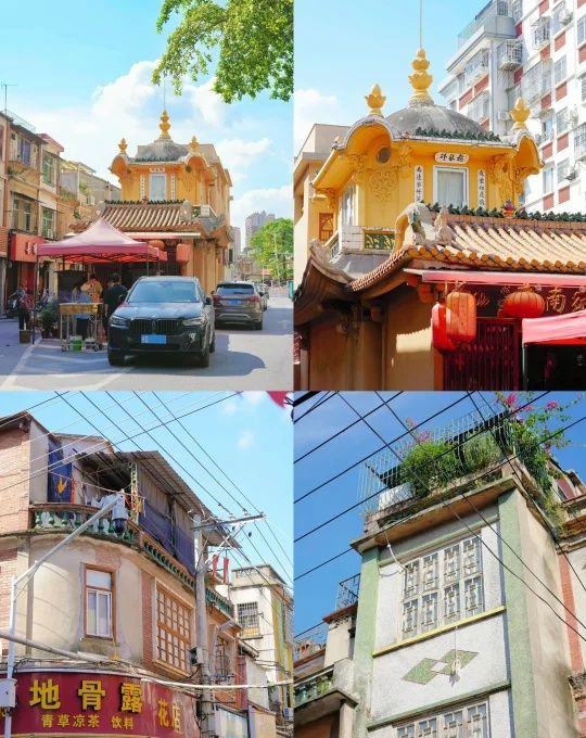 打石街中间矗立的这座寺庙,黄墙琉璃瓦搭配拜占庭式穹顶,建筑风格很特别。1924年扩建骑楼时,商户们为它让路,成了整条街上的“钉子户”