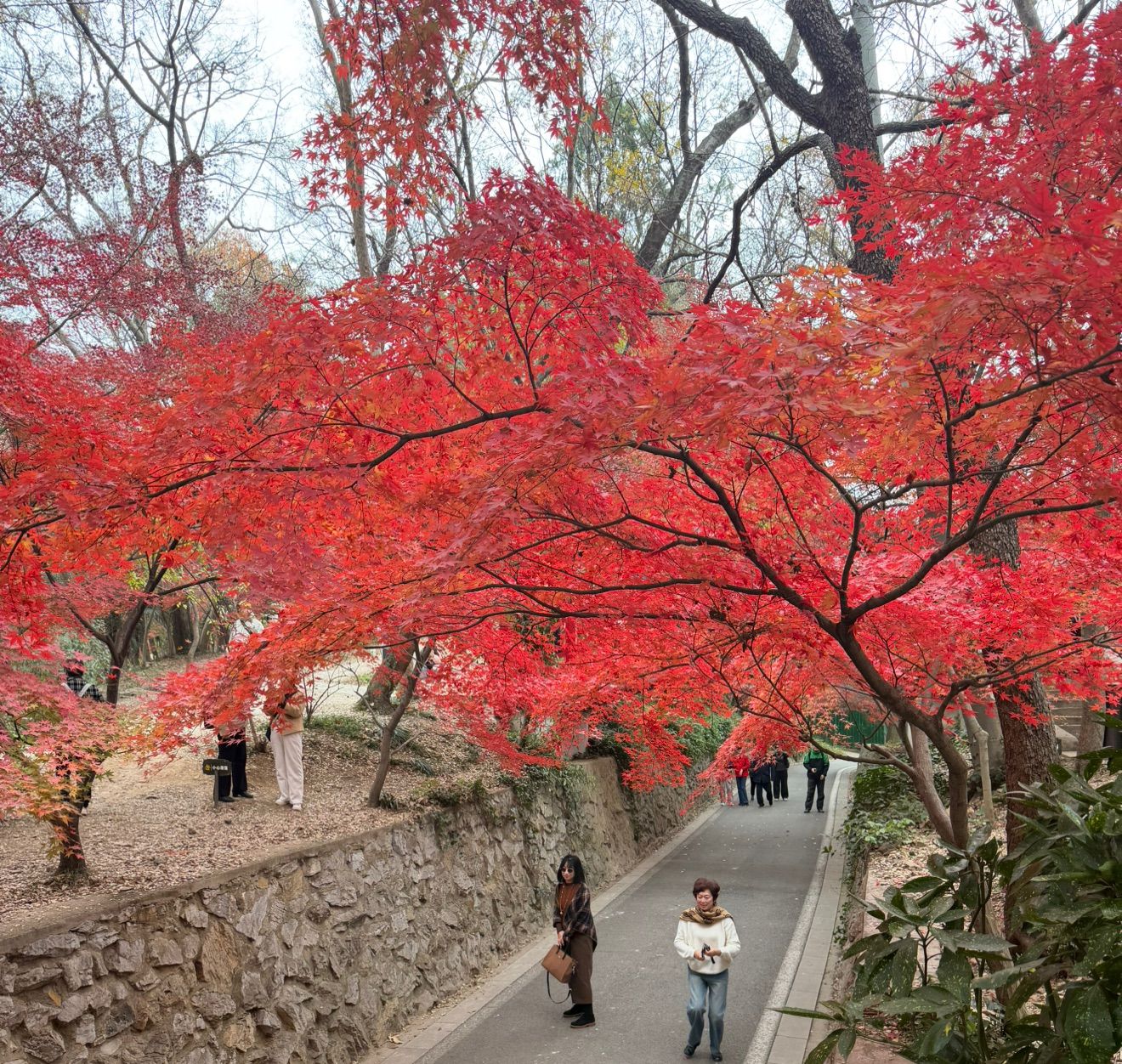 看了栖霞山的风景,你会认为,南京的赏枫可以结束了,原来我也是这样认为的,结果看了中山植物园红枫岗的红枫,才知这想法是大错特错。红枫岗的枫叶不同于栖霞山,她是另一种别样的风景,一大片枫叶集中在山岗上,层次分明,层层叠叠,色彩艳丽,有火红、橙色、绛紫、青色、明黄等,当阳光穿过树叶,一幅五彩斑斓的画卷就出现在你的眼前,如果此时正站在小红桥上,望着桥下川流不息的赏枫人流,你会感叹世上竟有如此美妙的赏枫之地。
