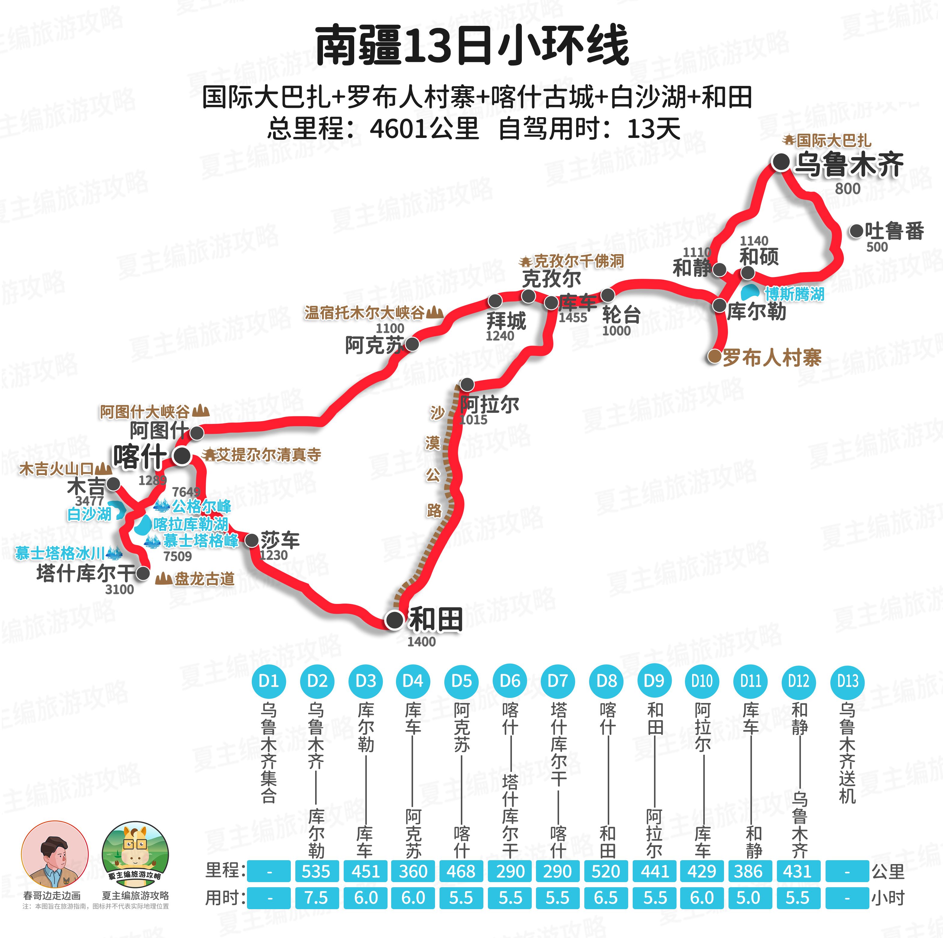 南疆的话,植被资源分布较少,大都是苍茫的戈壁、沙漠、雪山、峡谷等地貌,主要以体验喀什的的建筑、歌舞、工艺、饮食等方面的文化风情,以及喀什周边的西极村、白沙湖、喀拉库勒湖、慕士塔格峰与盘龙古道等景点为主。行程相对简单,具体参考图13的【喀什小环线】即可。
