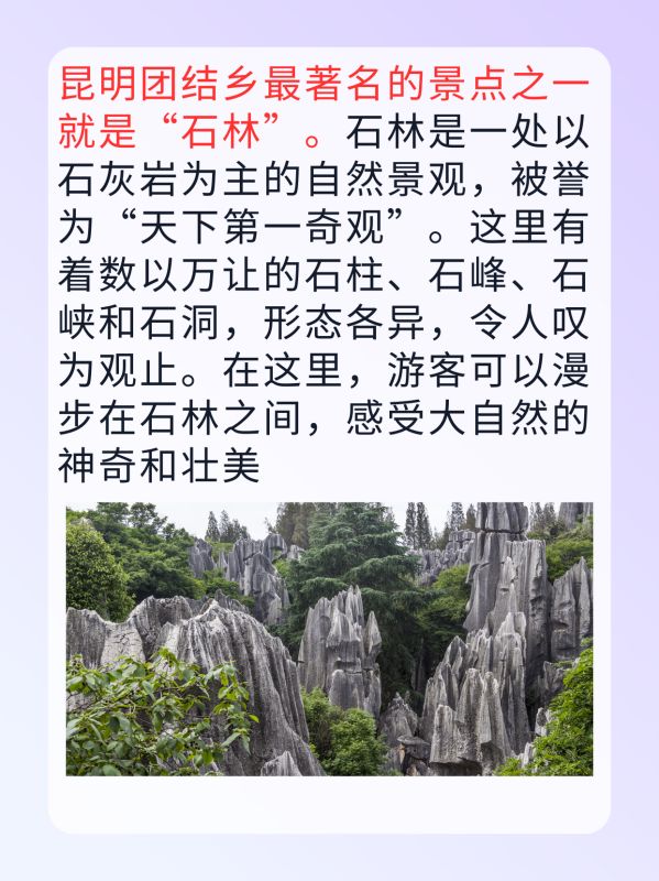 昆明团结乡最著名的景点之一就是“石林”。石林是一处以石灰岩为主的自然景观,被誉为“天下第一奇观”