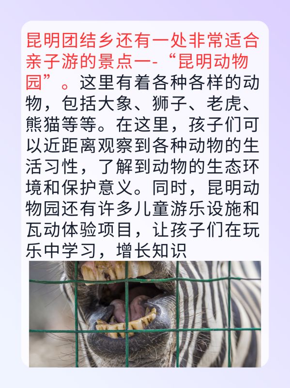 昆明团结乡还有一处非常适合亲子游的景点一-“昆明动物园”。这里有着各种各样的动物,包括大象、狮子、老虎、熊猫等等。