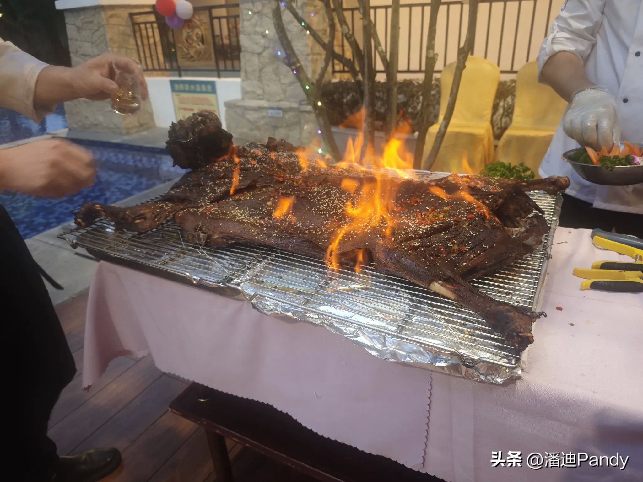 会议后的晚餐就安排在恒温泳池旁边,吃自助餐,以恩平本地特色美食为主,还特别安排了烤全羊,厨师现场制作,气氛非常的不错。