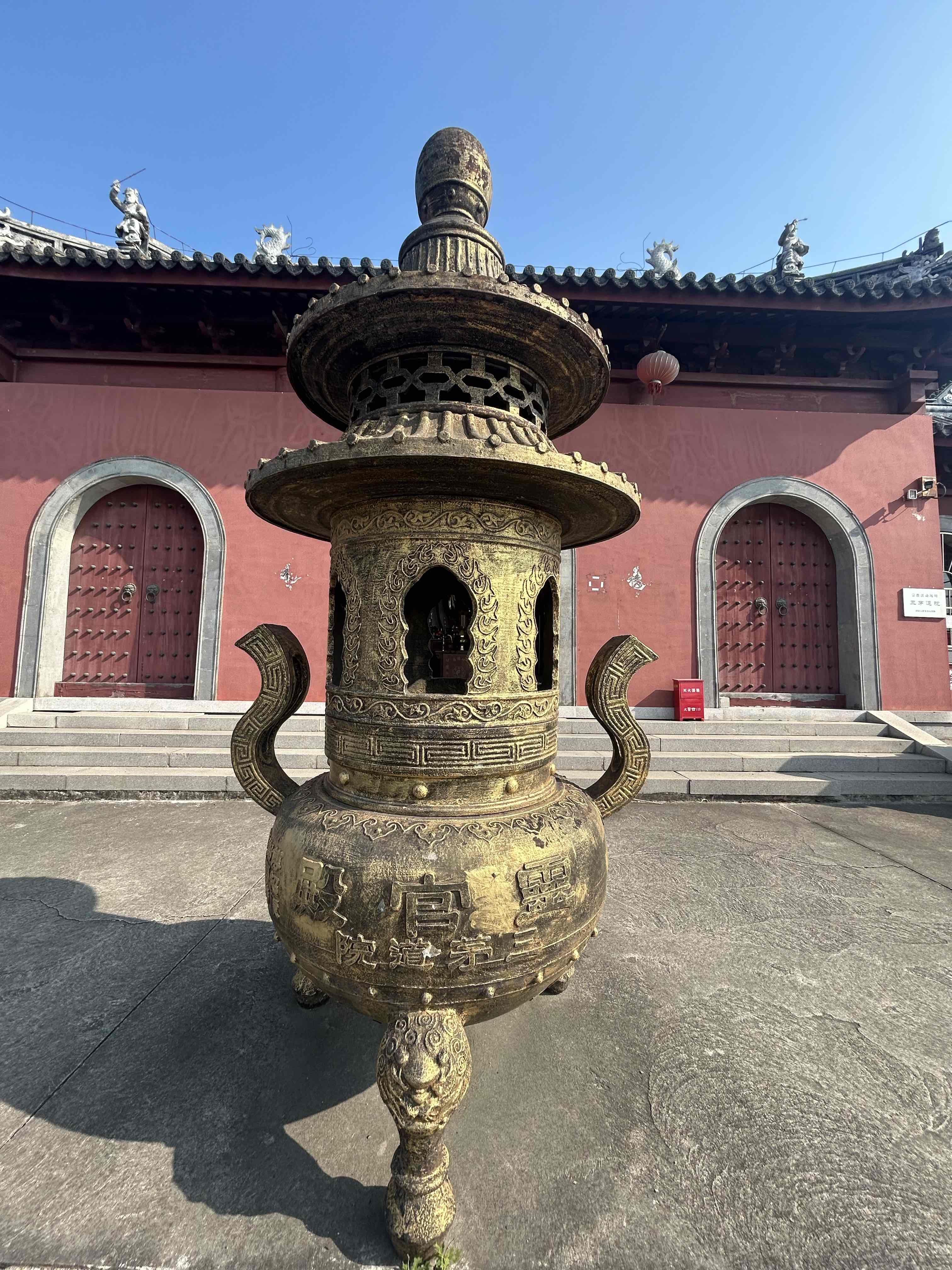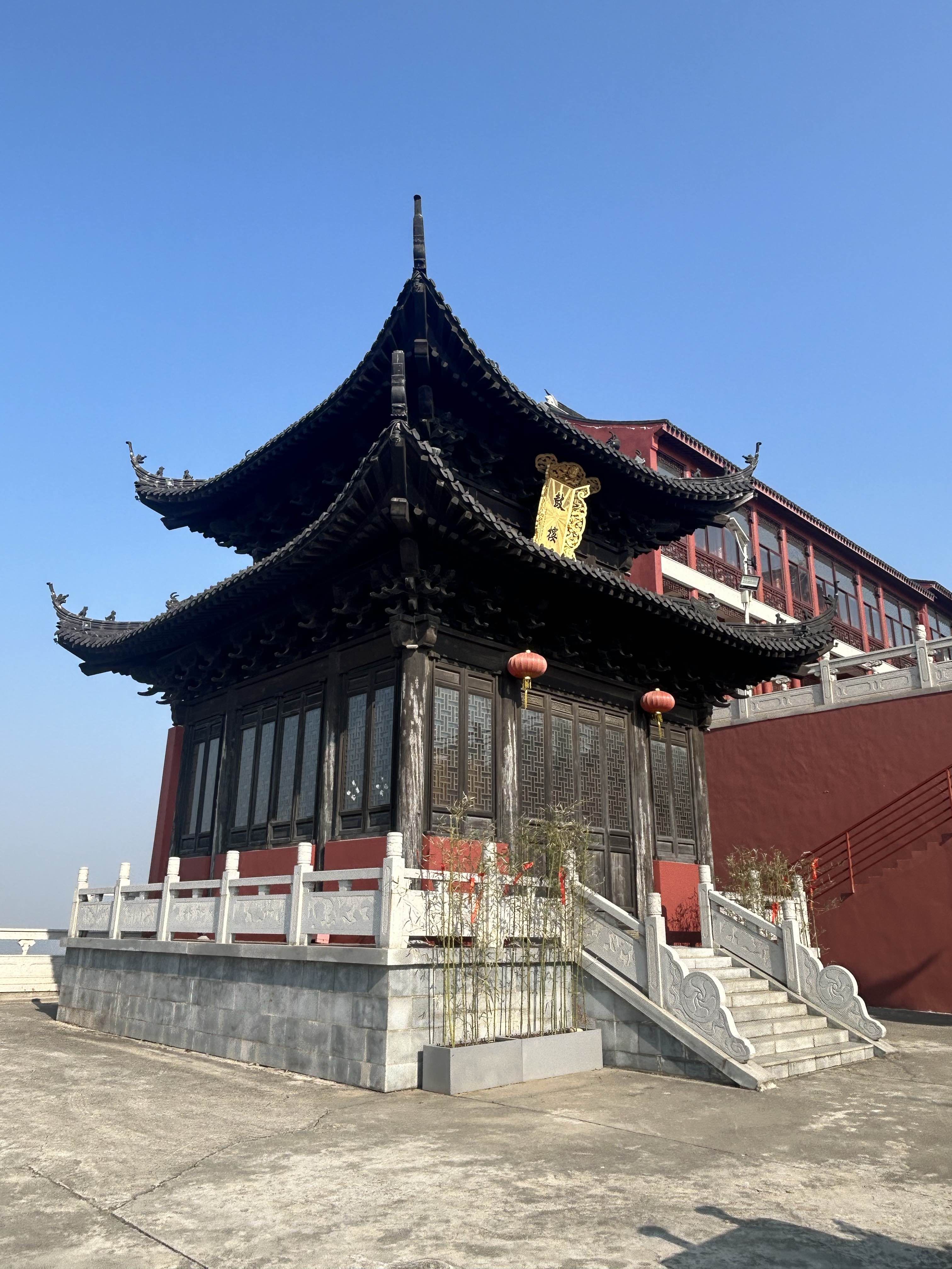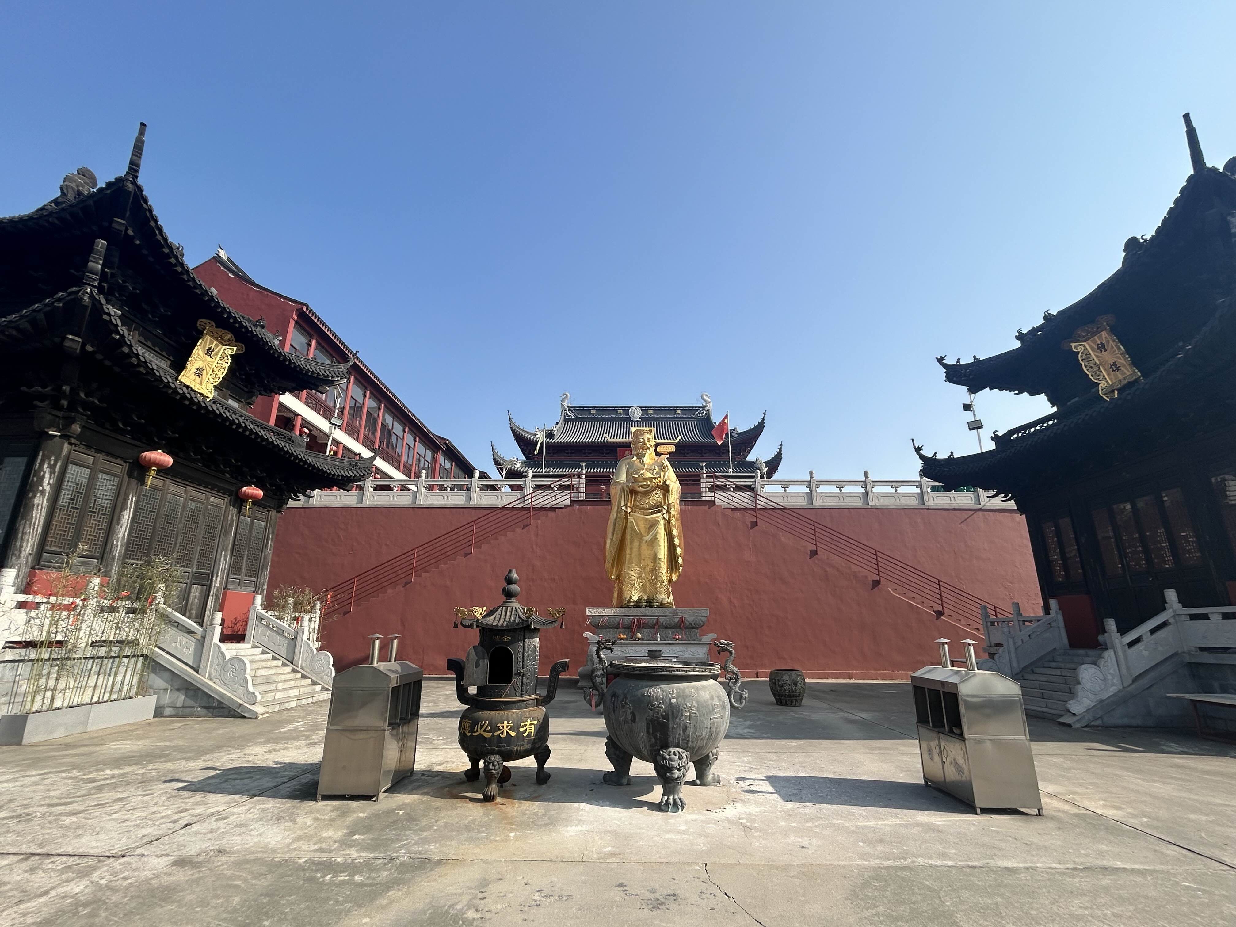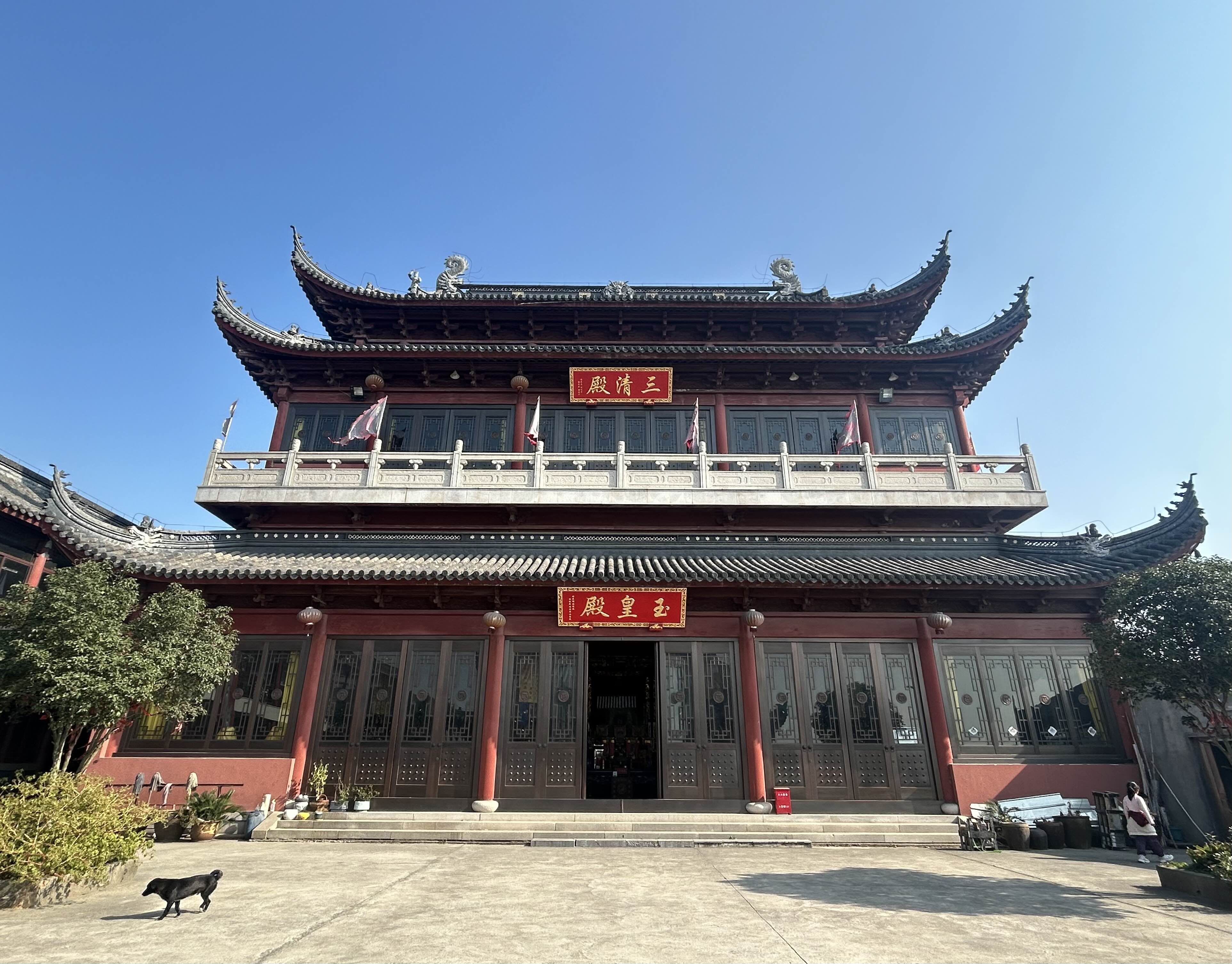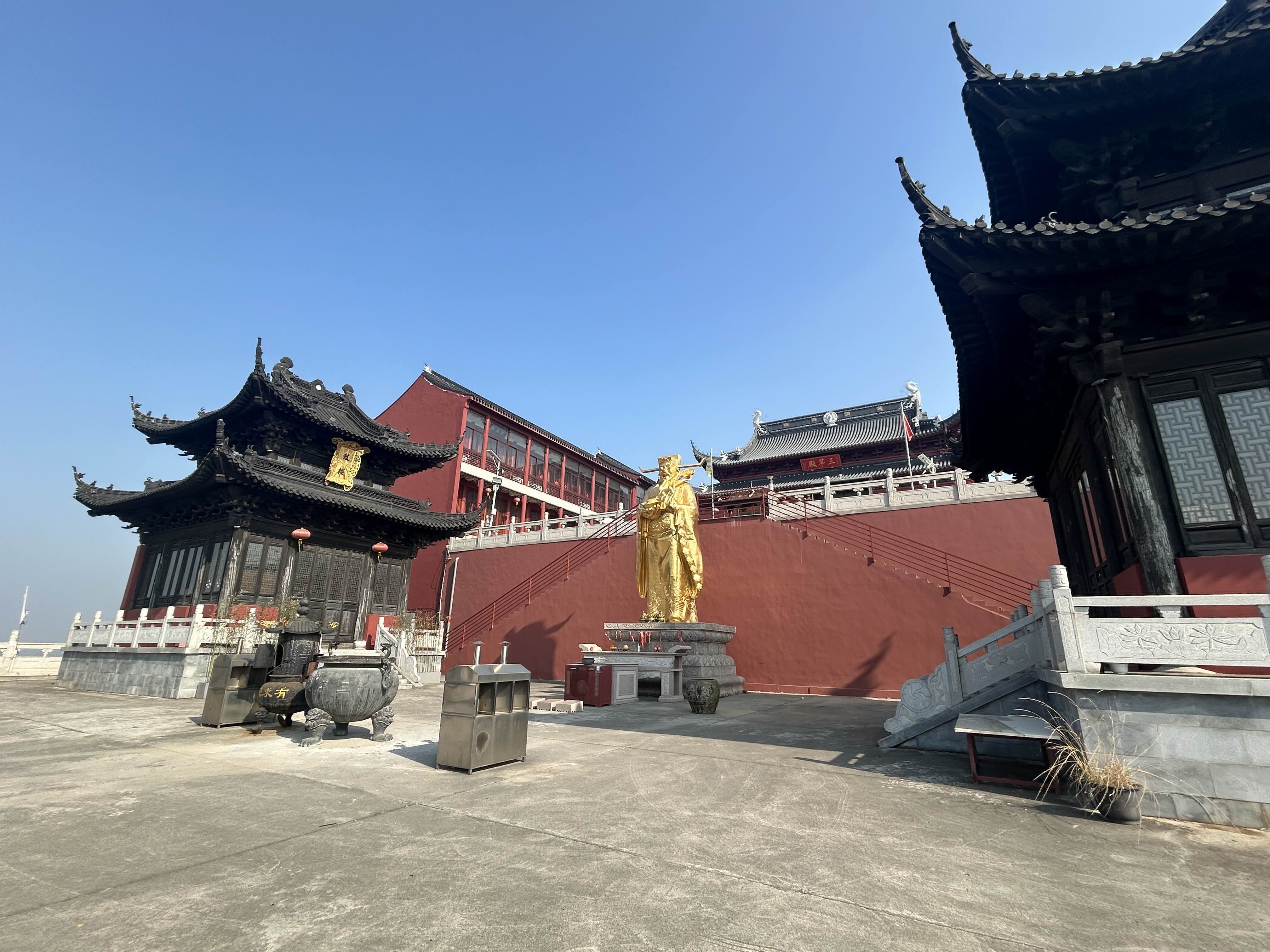 开车到秦望山脚下,登记一下就可上山,无须门票。上山是一条斜坡,也有人开车上山,我是走上去的,走到半山亭子,三茅道院就在眼前。拾级而上走到灵官殿前,殿旁有两面照壁,一面写着“上清宗坛”,一面写着“天人合一”,穿过灵官殿再走上一段台阶,就看见一尊金光闪闪的财神爷,财神爷的左右是钟楼和鼓楼,身后是三茅殿。三茅殿的后面是道院中最高的建筑玉皇殿和三清殿。