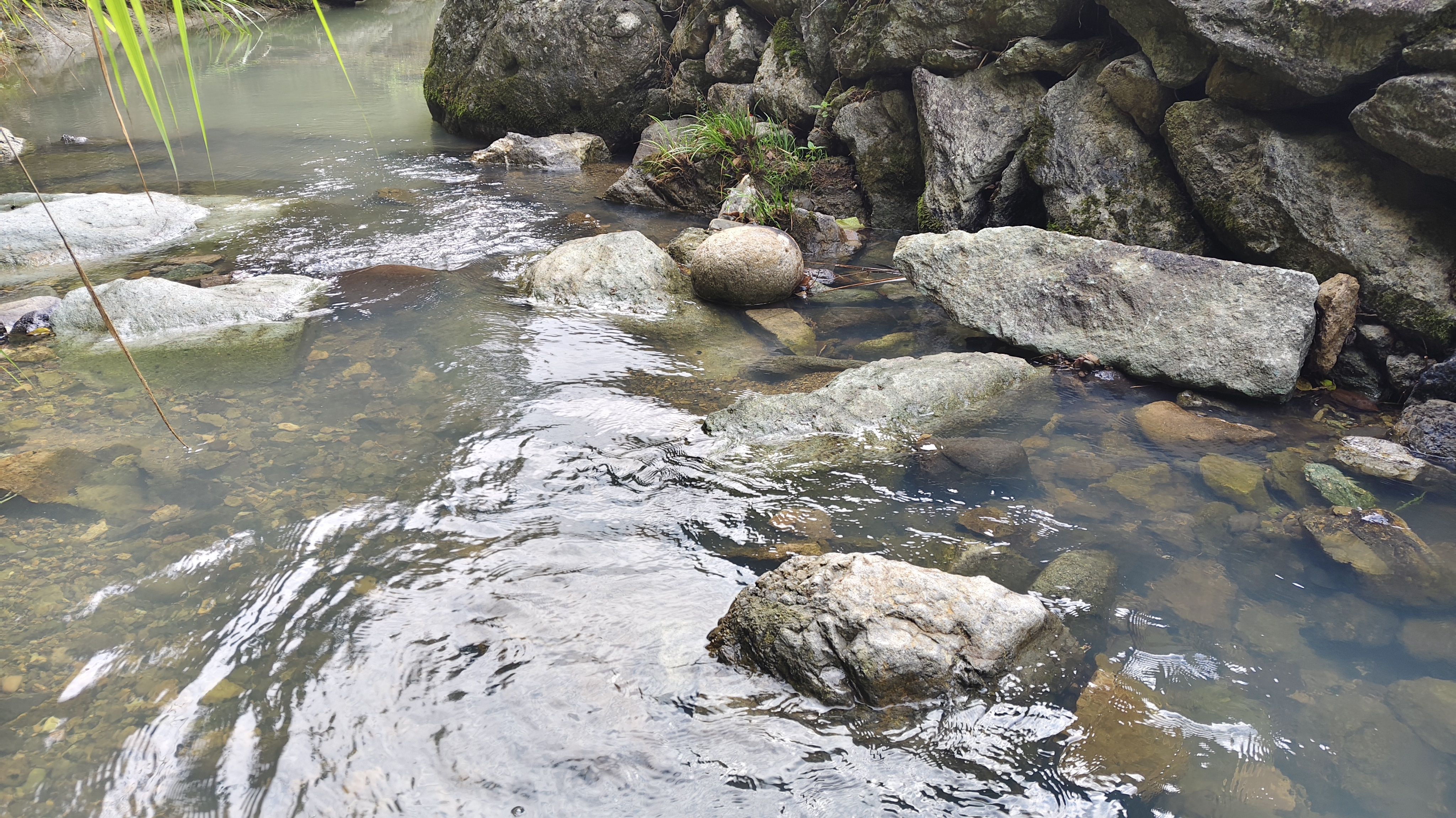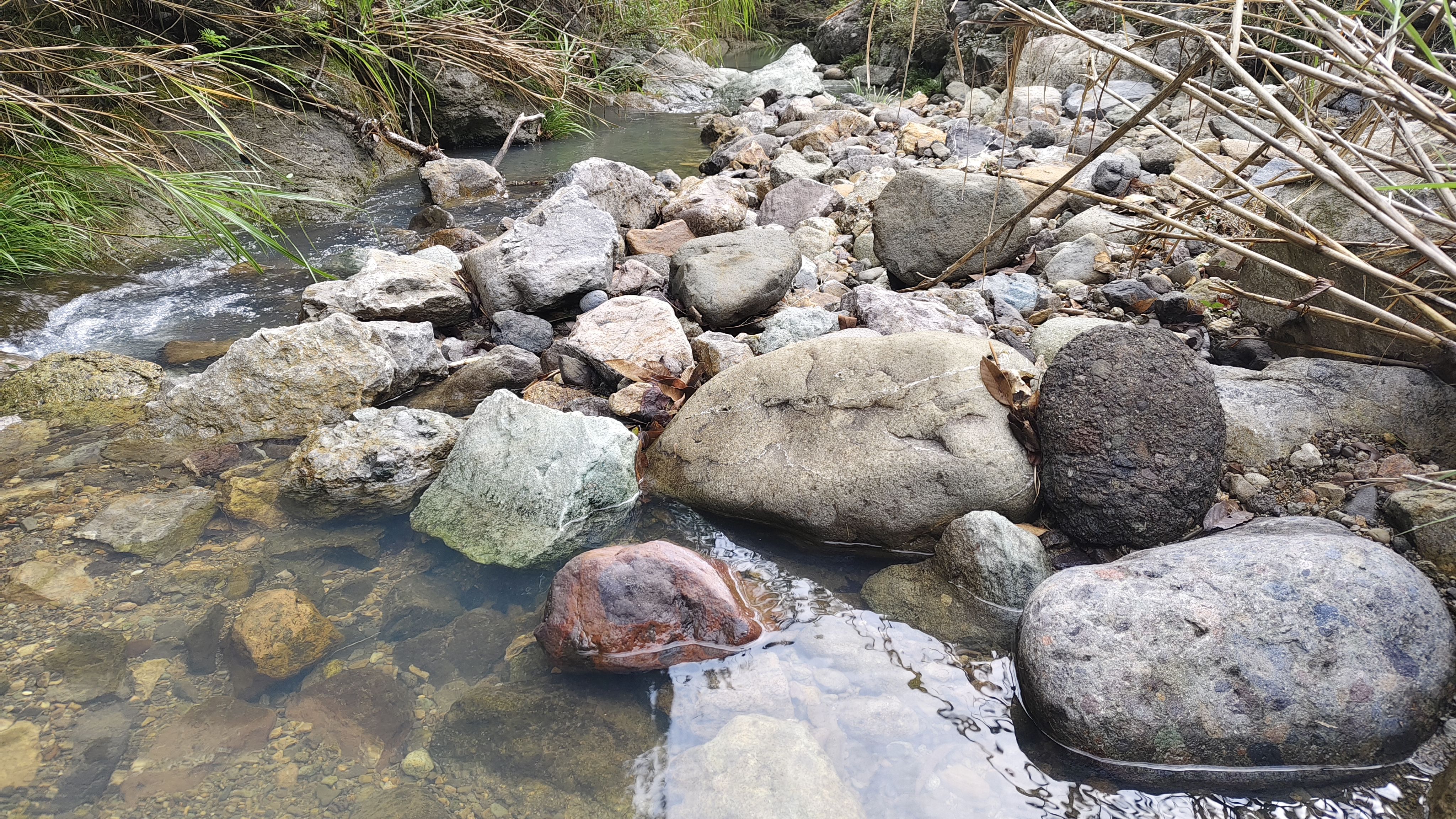 ……时间还早,走到悬崖山脚下,这条小溪。潺潺流水,泉水清澈见底。到了鸟停驻地方,看一下,有什么奇石。小溪里,看见,一块圆圆石头。挺好看的,这是大自然,一件天然作品。把它抱上来,四五十斤重,放到电动车上。带回来了……