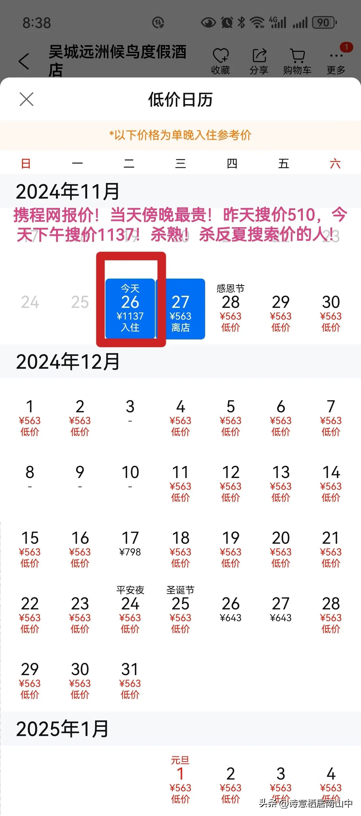 3,那知傍晚6点快到吴城时,趁休息停车就再查一下携程,当晚报价已翻倍上涨了,到了1137元!一个小镇的四星酒店怎么可能上千?或许携程大数据识别你在夜晚还没订到酒店,已走投无路了,趁人之危,大肆涨价了,想挣不义之财!可是,现在的人都会多网比价,谁会当冤大头呢?