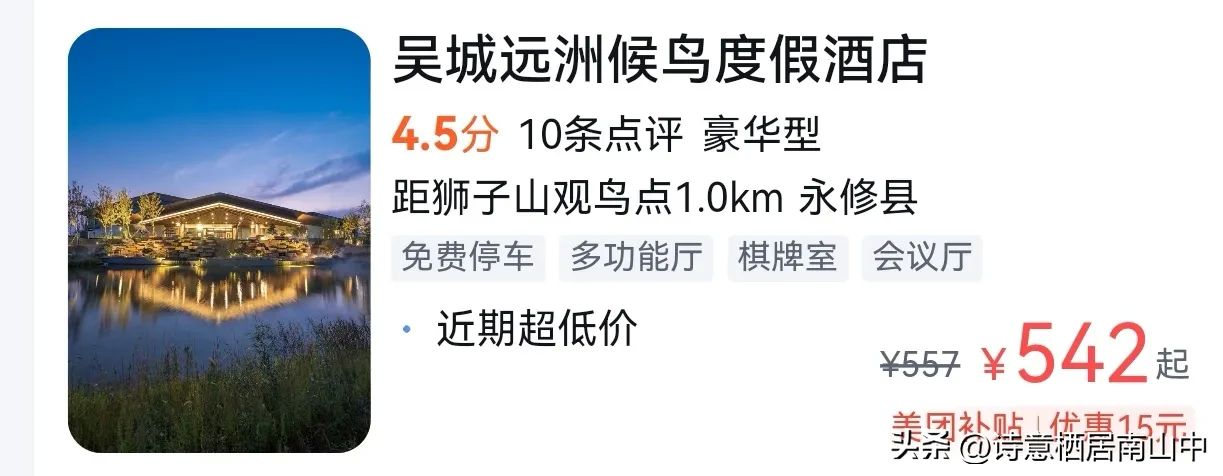 1,11底去鄱阳湖观鸟旅游,提前两天看了各攻略,网上介绍吴城候鸟小镇可入住最大洒店某店500元左右。查一下携程,果然是490~510元。