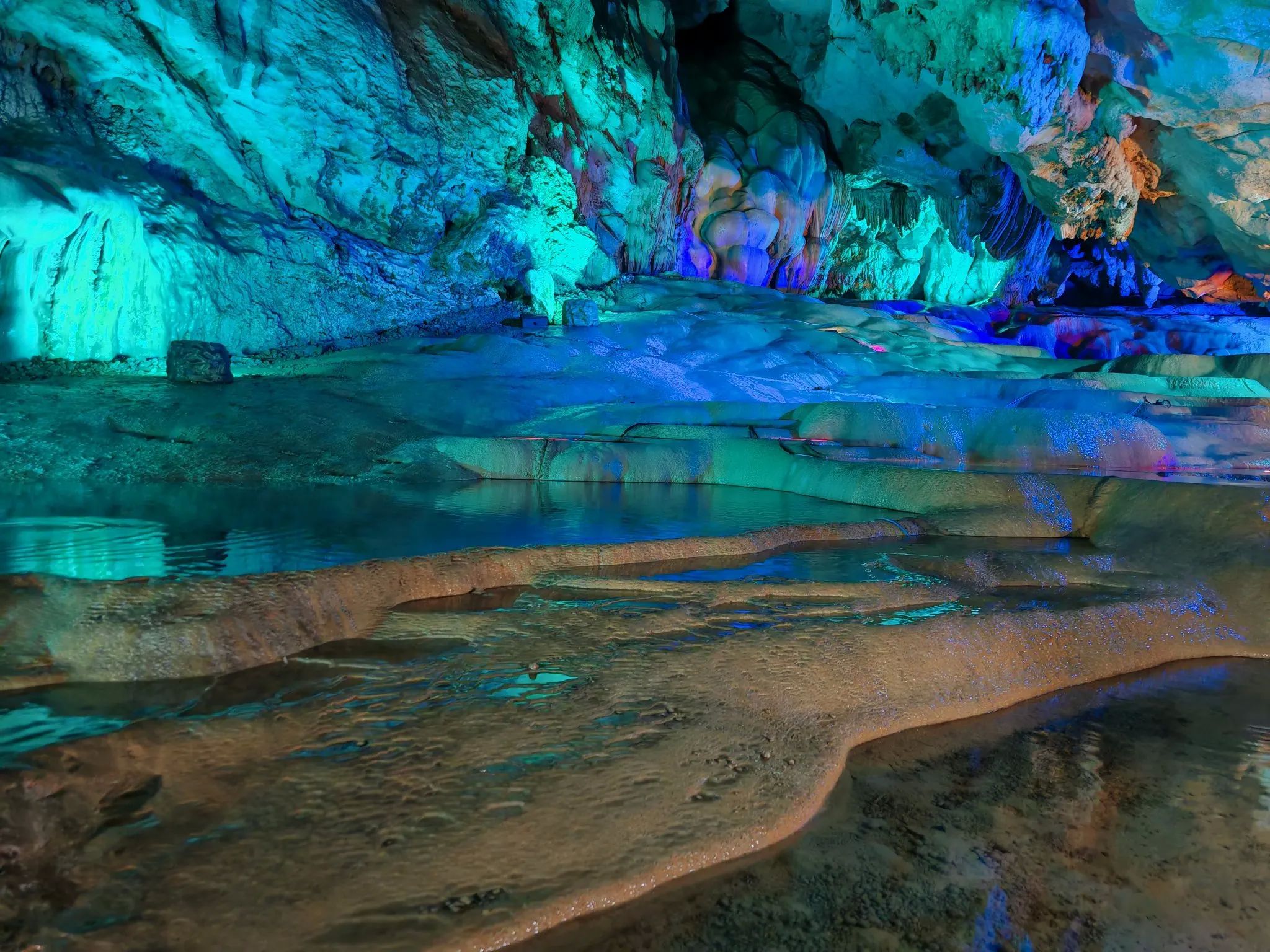 离开大石围天坑,我来到了逻妹莲花洞。一进入洞中,仿佛置身于一个梦幻般的水晶世界。洞内的钟乳石和石笋在灯光的映照下,呈现出五彩斑斓的色彩,有的像盛开的莲花,有的似倒挂的冰锥,有的如巨大的石柱,形态万千,栩栩如生。洞中的石幔、石瀑层层叠叠,在灯光的照射下,散发出柔和的光芒,宛如仙女的裙摆,轻盈飘逸。洞中还有一条蜿蜒的地下暗河,河水清澈见底,在灯光的映照下,波光粼粼,仿佛一条银色的丝带,为整个洞穴增添了一份灵动之美。