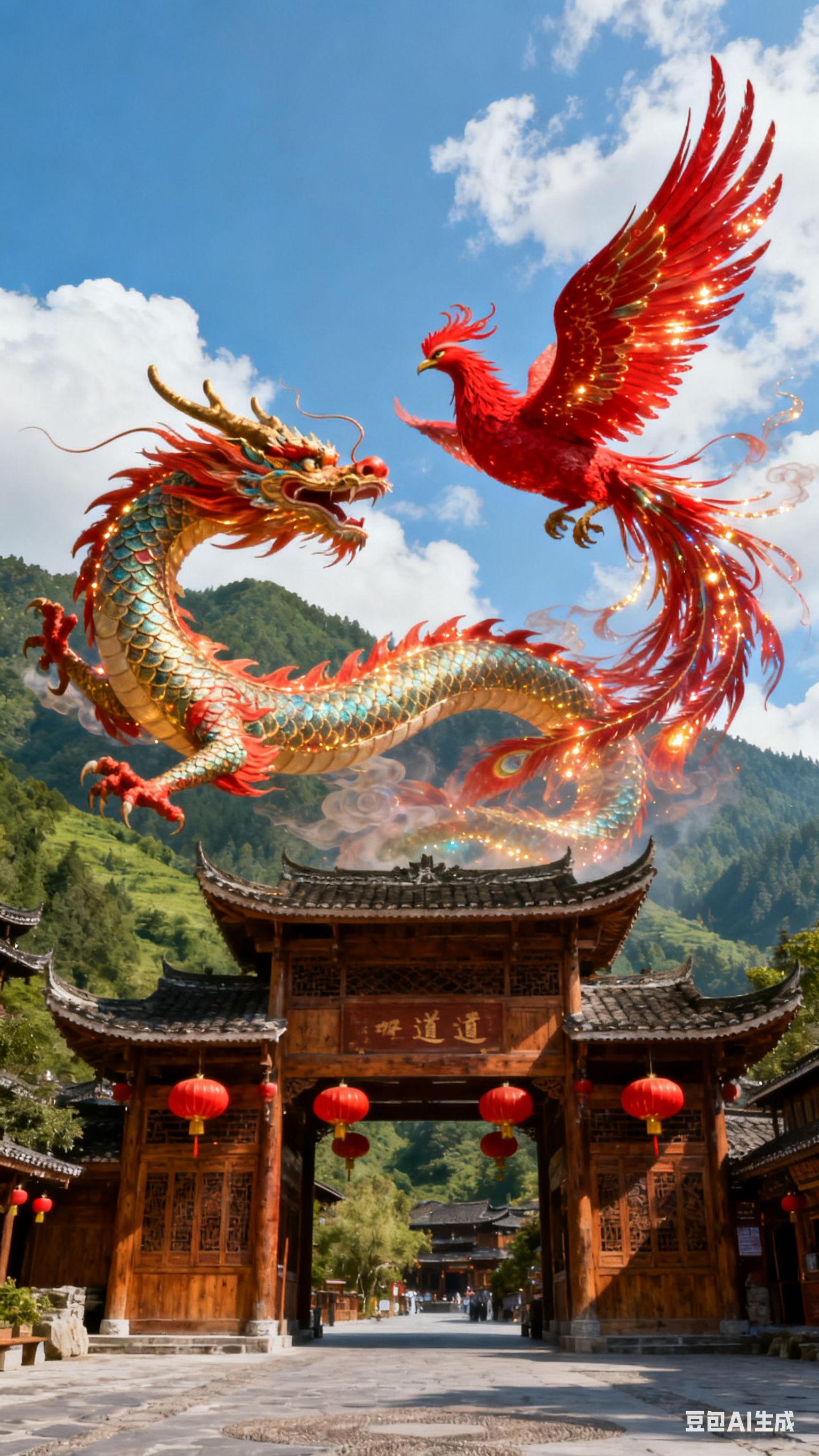 夜色渐深,篝火依旧熊熊燃烧,芦笙声、歌声、笑声交织在一起,回荡在苗寨的夜空。道龙与红凤立于观景台,俯瞰着灯火阑珊的千户苗寨,心中感慨万千。道龙吟出最后一首近体诗,作为此行的收官之作:“踏云来访苗疆寨,吊脚凌空接紫宸。一笔龙书惊天地,凤陪龙佑万年春。”红凤轻声和之,二人相视而笑,身影渐渐融入夜色之中,只留下那幅“中华天下一笔反八拖尾龙”,在苗寨的灯火下熠熠生辉,诉说着龙凤呈祥、国泰民安的千古愿景。