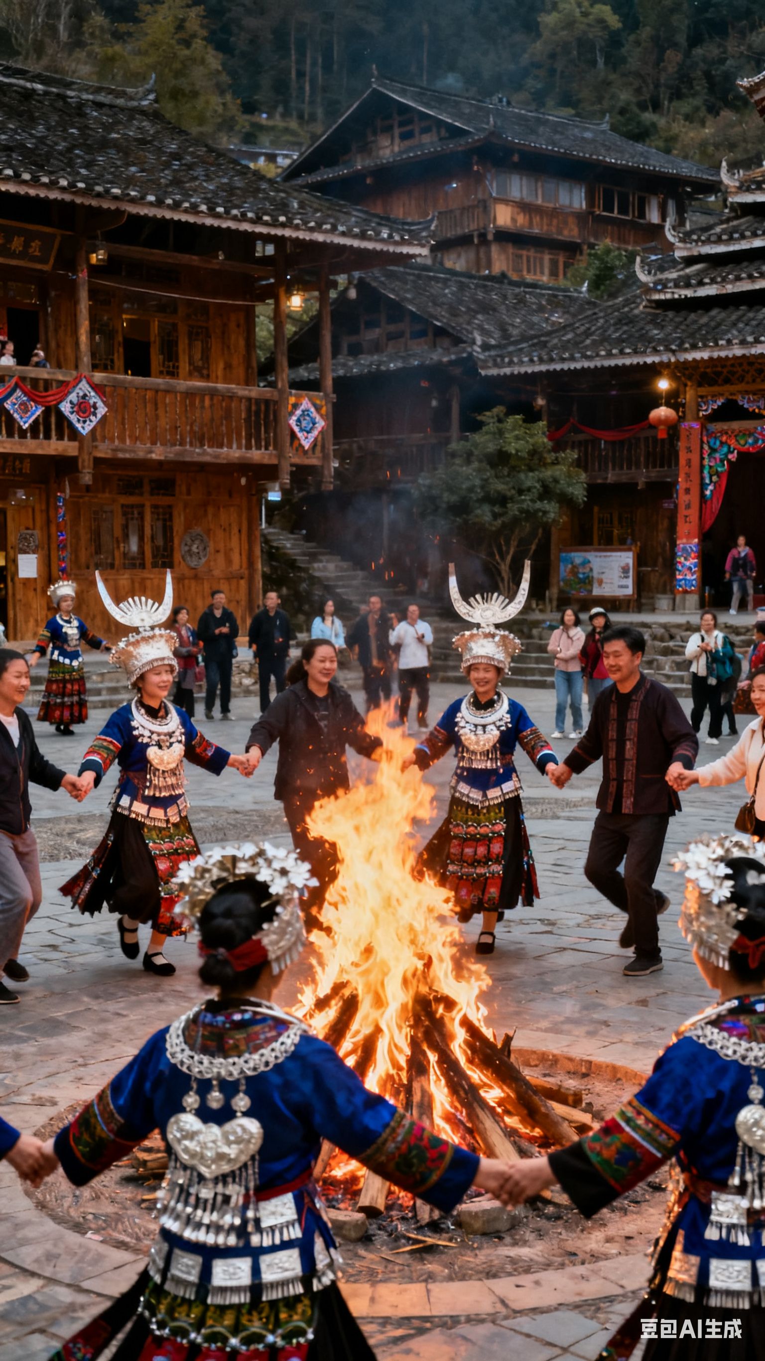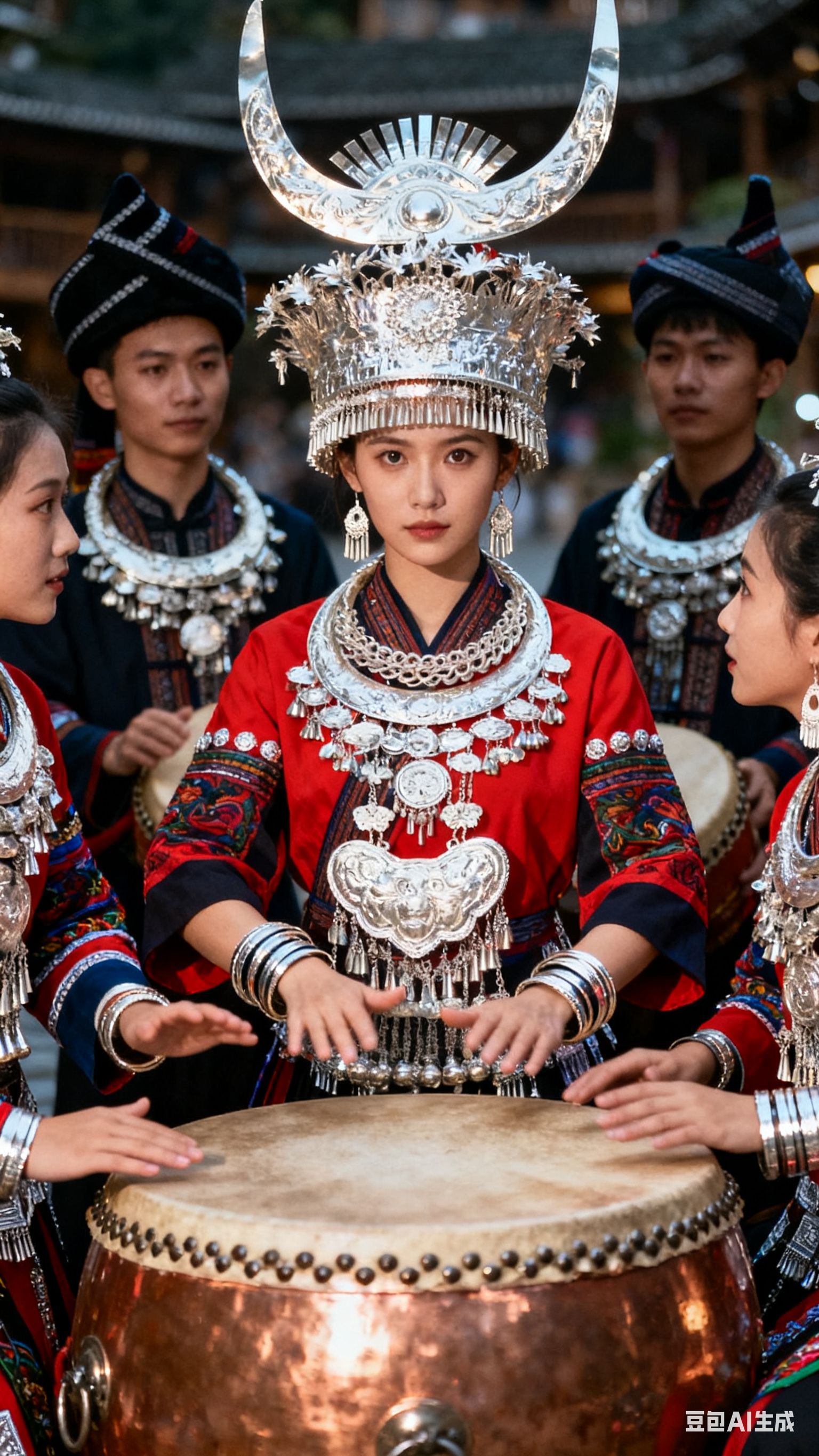 沿白水河前行,忽见一群苗女身着盛装,银冠银角熠熠生辉,正在跳铜鼓舞。鼓点铿锵,舞步轻盈,银饰叮当声震山谷。红凤看得入迷,轻声吟道:“铜鼓声声震碧霄,苗家儿女舞姿娇。银冠闪烁惊鸿起,醉里东风拂鬓腰。”道龙凝视鼓面,只见纹饰古朴,似有龙纹隐现,随口和之:“鼓点沉沉诉古今,苗疆儿女赤诚心。银铃摇落千年韵,一曲欢歌动客襟。”