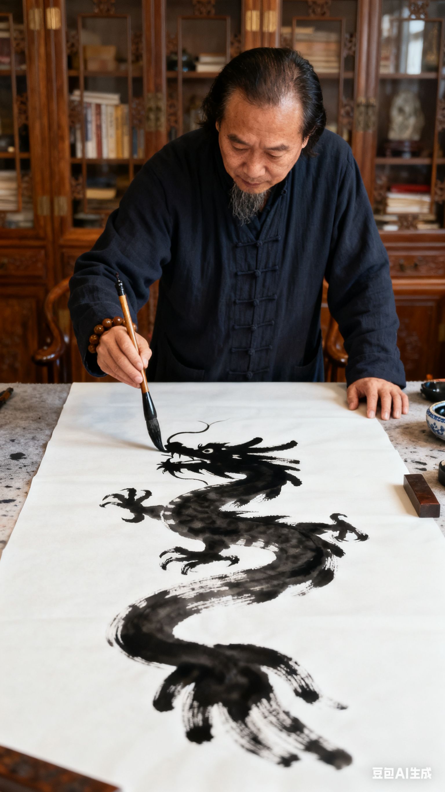 暮色渐浓,寨中燃起篝火,苗胞与游客围着篝火跳起摆手舞。红凤加入人群,裙摆飞扬,道龙立于一旁,目光如炬,忽有灵感迸发,对红凤道:“如此盛景,当以巨笔书龙,以抒胸臆。”红凤颔首称善,命随从铺开二米四长的宣纸,道龙凝神静气,饱蘸浓墨,大喝一声:“起!”玄铁笔如游龙出海,笔走龙蛇,“中华天下一笔反八拖尾龙”跃然纸上,龙身蜿蜒,龙尾拖曳,气势磅礴,围观游客惊呼不已。
