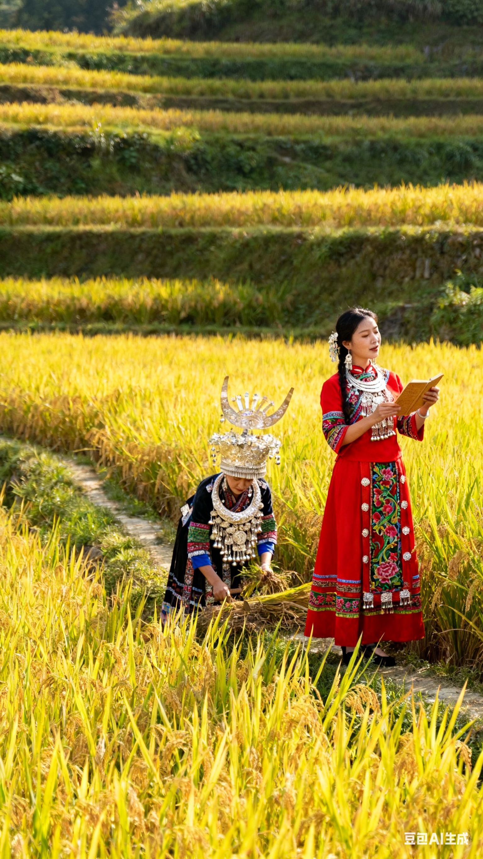 红凤轻拂衣袖,目光掠过梯田,稻浪翻金映霞辉,苗女腰系银铃在田间劳作,歌声随风吹送:“黔岭秋光入画屏,梯田叠翠接云平。苗姑月下簪花笑,银铃摇落满天星。”道龙颔首应和,笔锋暗转:“白水河边吊脚横,炊烟袅袅绕山行。苗家自有千秋韵,不羡江南二月晴。”二人并肩前行,脚下青石板路被岁月磨得发亮,两侧商铺悬挂着蜡染布、银饰件,苗胞笑脸相迎,暖意融融。