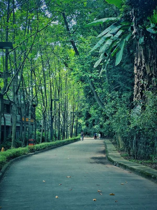 沿右侧环园路漫步,但见绿水流波,青山起浪,城中竟藏如此幽静之地。路面起伏,道旁绿蕨红遍,玉叶生花,晨露未晞,于草尖闪烁如星。行至西边,环园路戛然而止,遂顺石壁小径上山。亭台几座点缀其间,檐角飞举,似欲挽留过往云烟。