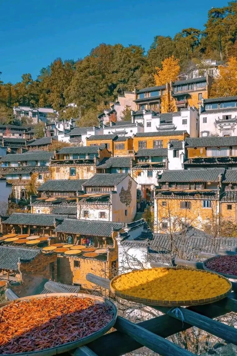 婺源的秋天是多彩的。十一月中下旬,婺源的山林被红叶和黄叶染成一片片绚丽的色彩。石城村是婺源赏秋的绝佳之地,清晨的薄雾中,红枫与古村落相映成趣,仿佛置身于一幅水墨画中。此外,篁岭的“晒秋”民俗也是一大亮点。家家户户在屋顶上晒着红辣椒、稻谷等农作物,一片片红黄相间,充满了浓郁的乡村气息。