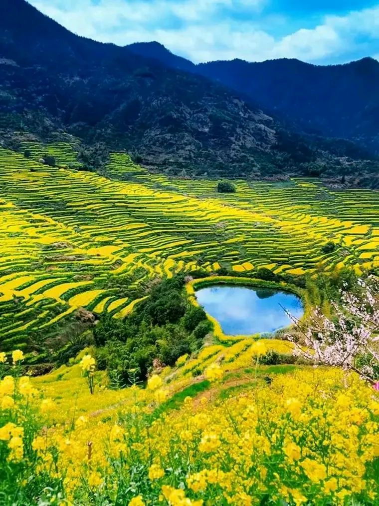 婺源的春天是金色的。每年三月中下旬,油菜花盛开,漫山遍野的金黄与古朴的徽派民居相映成趣。江岭是婺源最著名的油菜花观赏地之一,站在梯田高处,金黄的花海与远处的青山绿水构成了一幅绝美的画卷。此外,月亮湾、庆源村、晓起村等地也是赏花的好去处。
