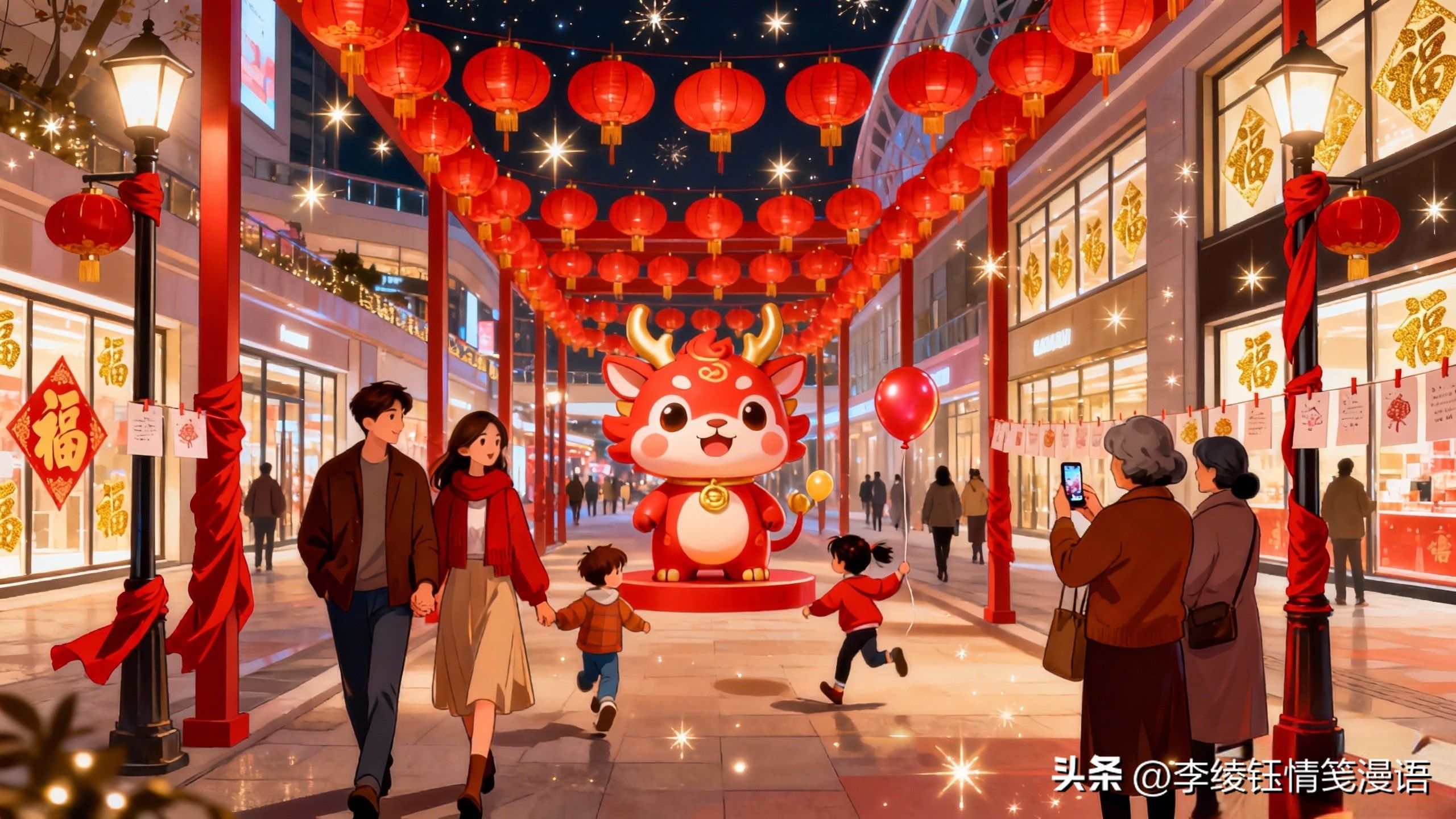 商圈里的新年美陈,更是把“年味”藏在了每一个角落。光谷广场上,巨大的红色灯笼串挂在廊道上,中间立着憨态可掬的生肖造型,路过的人都忍不住停下脚步拍照;楚河汉街的沿街店铺,窗户上贴满了金色的福字,连路灯杆上都裹着喜庆的红绸,晚上亮灯后,整条街像被撒了星光,情侣们牵着手慢慢走,小朋友追着手里的气球跑,还有阿姨们凑在一起,对着美陈摆出各种姿势拍视频,嘴里念叨着“这也太好看了,发朋友圈肯定赞多”。偶尔还能碰到商圈里的迎新活动,有人在写新年心愿卡,有人在参与互动小游戏,笑声、欢呼声混在一起,满是热闹的烟火气。