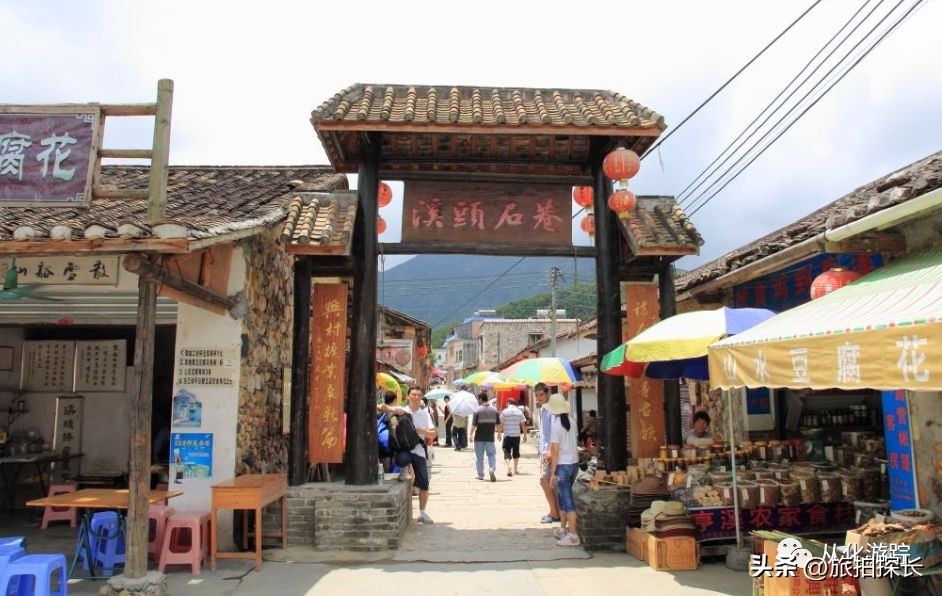 “溪头石巷”,这个牌坊非常经典,很多游客都会在这里拍照留念。牌坊后,就是溪头最旺的地方之一,溪头土特产巷,里面摆卖着各式从化特产,有人说溪头村商业化了,失了原来的淳朴,也有人在这里看到了最真实的人间烟火味。