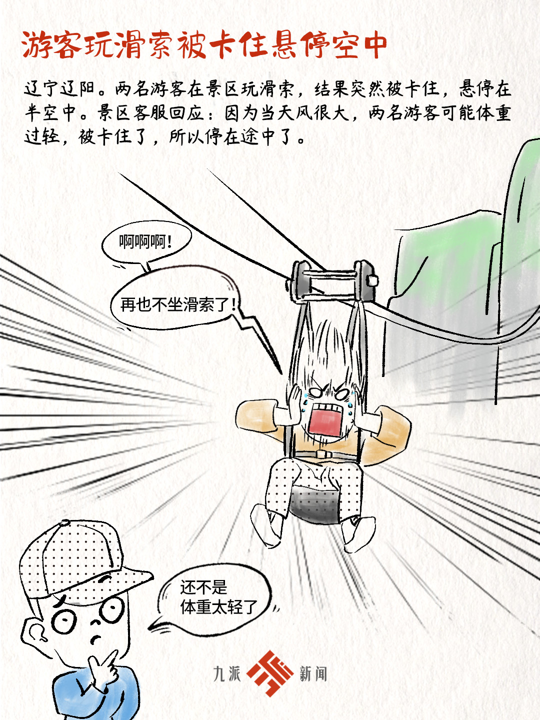 辽宁辽阳。两名游客在景区玩滑索,结果突然被卡住,悬停在半空中。景区客服回应:因为当天风很大,两名游客可能体重过轻,被卡住了,所以停在途中了。