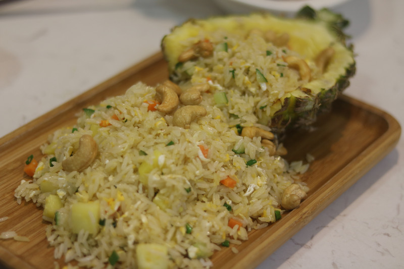 黄金菠萝饭作为主食,也是绝对不能错过的,一整只大菠萝切开,果肉一点也不酸,搭配着米饭,辅以各种佐料,其中还有我最喜欢的腰果,吃到嘴里一点也没有传统蛋炒饭的那种油腻感,水果的香味与米饭的香味融合在一起,即便是满满的碳水,这次也认了。