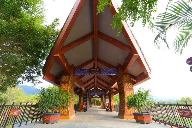 进入园区后可以看到当天演出的公告及时间。迎宾桥是黎族人民欢迎客人的一种方式,它的原型是船型屋,当初黎族人民渡过海峡来到海南后连续遭遇暴雨,他们急中生智把渡海所乘的船倒扣过来,就成为遮风挡雨的最佳场所。后人们为了纪念先祖当初艰苦生活便以船型屋为原型建造了迎宾桥。